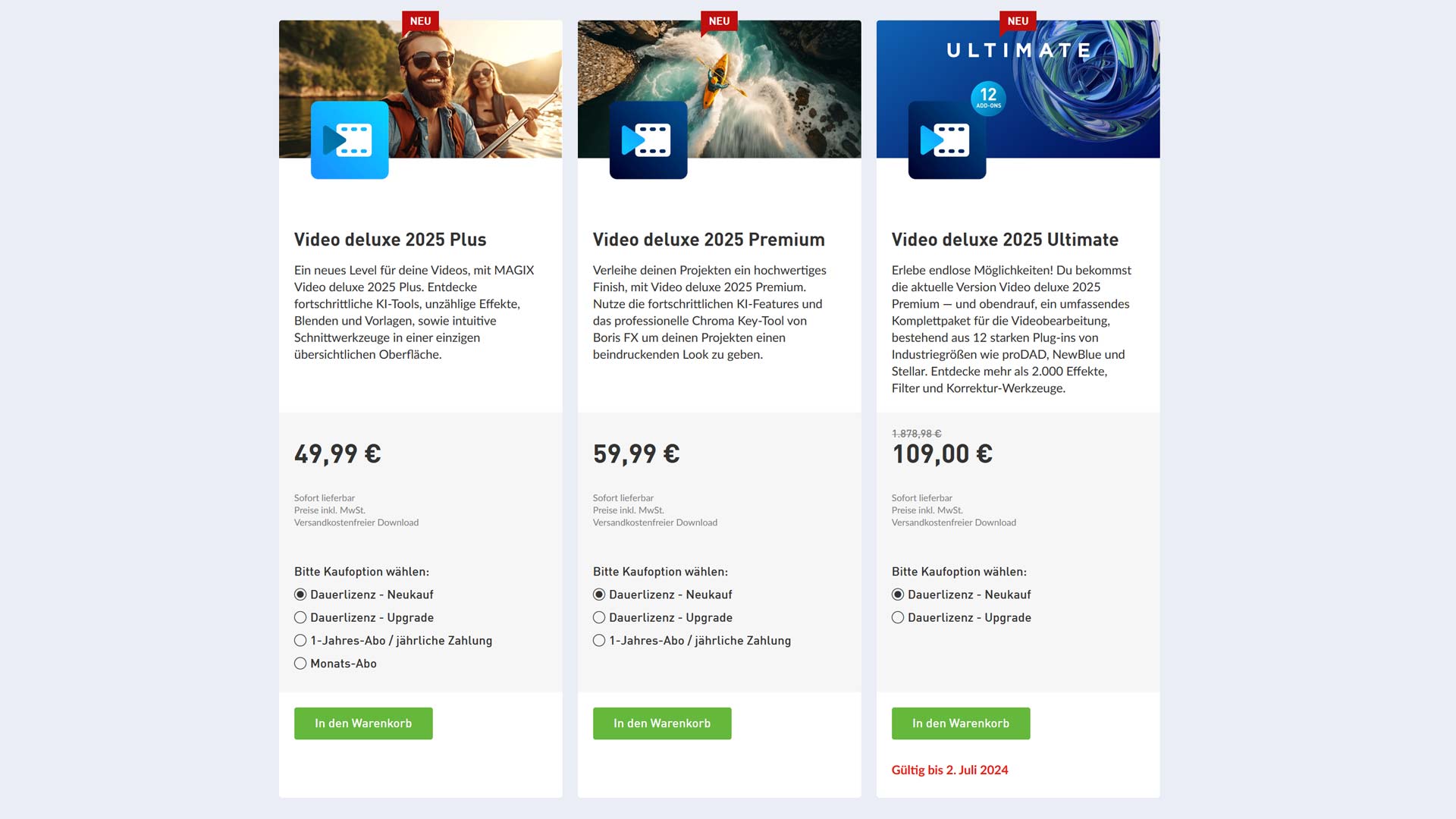 Im Sortiment sind mit Plus, Premium und Ultimate noch drei Varianten. Video Deluxe Classic gibt es nichtmehr - dafür sind die anderen Versionen günstiger geworden. Die ausführliche News zu Magix Video Deluxe 2025 gibt es hier.