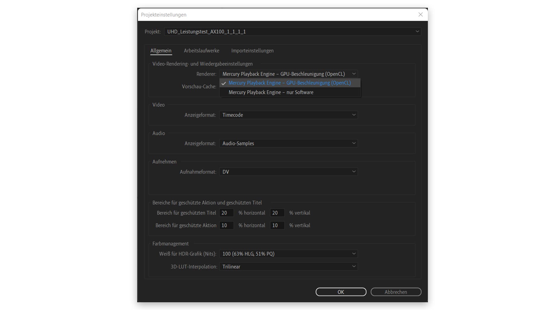 Schaut man in Adobe Premiere Pro CC 2022 in die Projekteinstellungen, erkennt man auch hier, dass die GPUBeschleunigung bereitsteht.