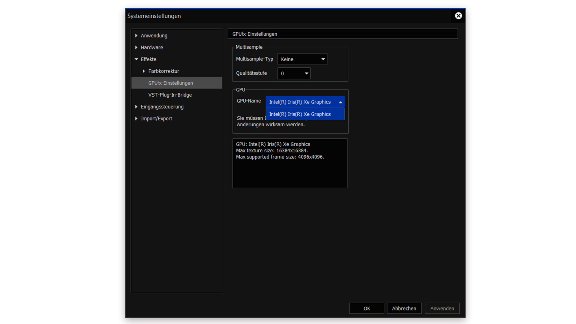 Edius X erkennt die Intel Iris Xe GPU umgehend und lässt diese dann etwa für die Farbkorrektur zuweisen.