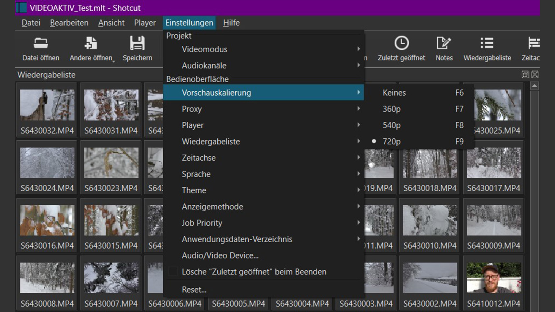 Gerade auf schwächeren Systemen lohnt es sich die Vorschauqualität herunterzusetzen. Auch in 720p sieht das Vorschaubild auf einem Laptop-Bildschirm noch ordentlich aus, sodass man flüssiger schneiden kann.