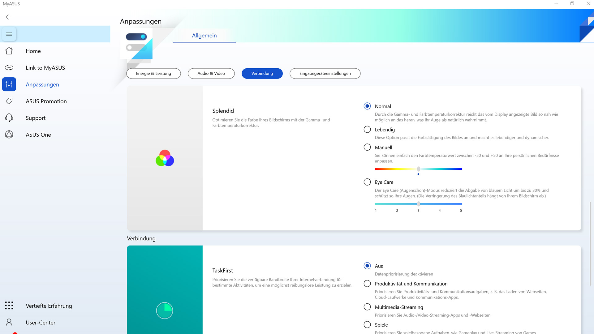 Über die My-Asus-Systemsoftware kann man die Akku- und Leistungseinstellungen bestimmen sowie diverse Farbprofile voreinstellen.