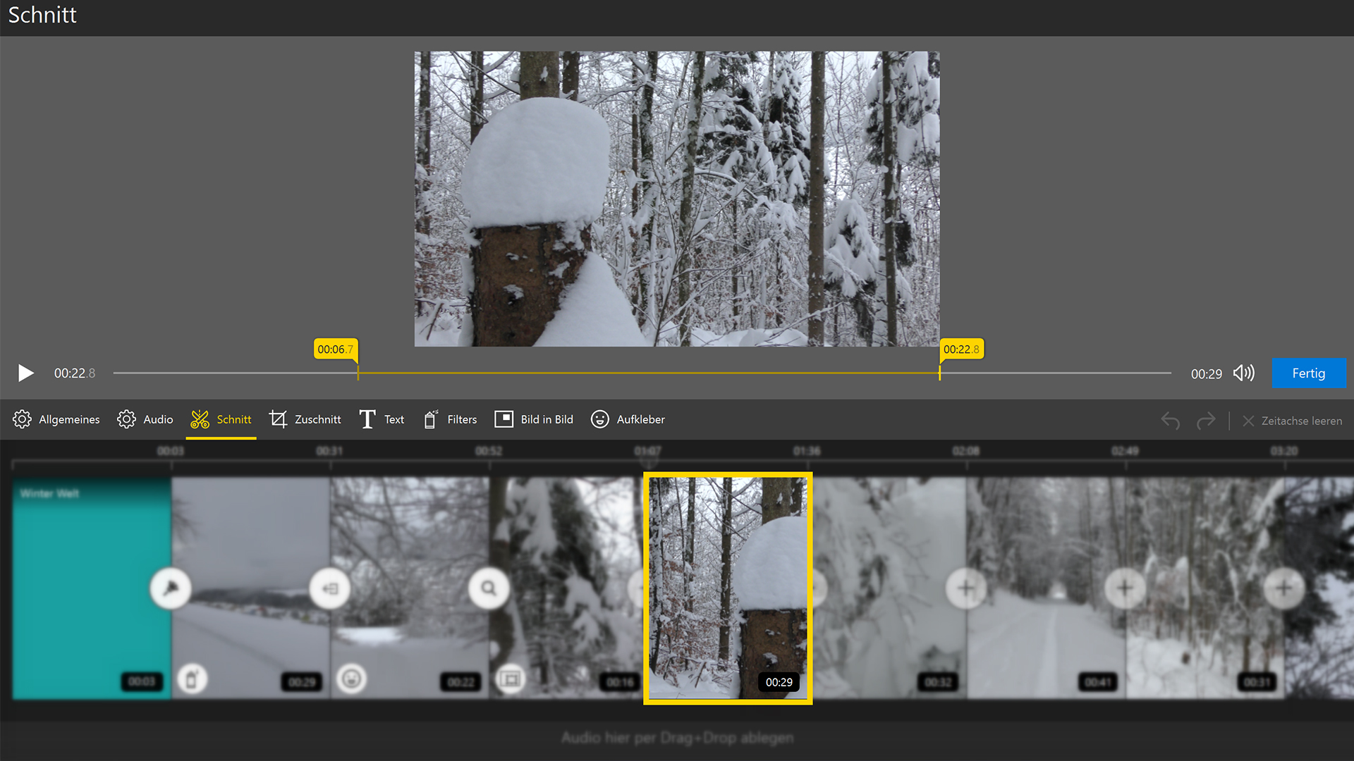 Der Icecream Video Editor nutzt keine Zeitleiste sondern stellt lediglich ein Storyboard bereit. Das Trimmen und Bearbeiten hat uns direkt an den Video Editor aus Windows 11 erinnert.