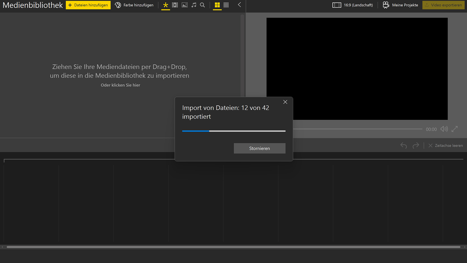 Was schon nach kurzer Zeit deutlich wird: Die Software richtet sich klar an Einsteiger und Neulinge in den Videoschnitt. Zu keiner Zeit fühlt man sich überfordert oder hat das Gefühl man könnte den Überblick verlieren. Alle Schaltflächen sind klar platziert und übersichtlich angeordnet. Nur die deutsche Übersetzung ist an einigen Stellen mit „Stornieren“ anstatt „Abbrechen“ nicht ganz sauber gelungen. Die Bedienung geht - mit Blick auf den Anspruch des Programms - entsprechend einfach vonstatten. Man importiert sein Rohmaterial und kann dann per Drag and Drop oder via Doppel-Klick auf einen Clip das Storyboard befüllen. Alle Clips ordnet die Software automatisch hintereinander an. Allerdings dauerte das Einlesen von eigentlich sehr „handzahmem“ UHD-50p-Romaterial im MP4-Format in unserem Test bei rund 40 Dateien ziemlich lange. Am Rechner und am Speicher konnte es nicht liegen, die sind schnell genug. Parken die Dateien aber mal im Medienbrowser kann man sie durch „Überfahren“ mit dem Mauszeiger in Apple-Final-Cut-Manier vorschauen. Nettes Detail übrigens: Über den Button „Farbe hinzufügen“ lässt sich eine Farbkarte für einen Vollfarben-Hintergrund einsetzen, manche davon auch mit einem schicken Verlauf. Wir haben
