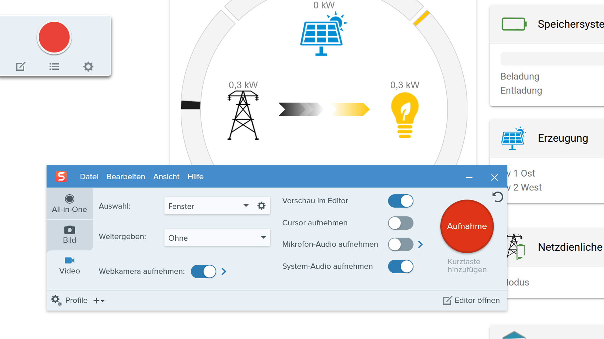 Das kleine Widget (oben links) dockt sich an den Bildschirmrand an und wird zu einer dünnen blauen Linie. Das eigentliche Capture-Fenster präsentiert die Optionen übersichtlicher.