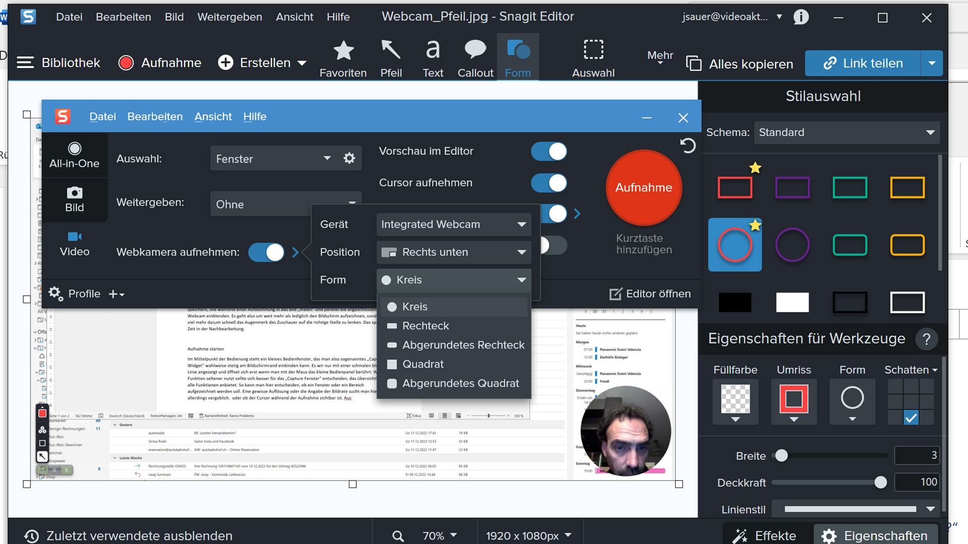 Eigentlich war Snagit das Werkzeug für Screenshots – doch inzwischen beherrschen Windows- und Mac-Rechner das „Ausschneiden und Skizzieren“ (ehemals Snipping-Tool) oder ein Bildschirmfoto (Mac) schon so gut, dass man nur für spezielle Ansprüche eine eigene Software installiert. Entsprechend bohrt TechSmith die Funktionalität von Snagit auf – und integriert dabei viele Funktionen, die bisher dem echten Screen Recorder Camtasia vorbehalten waren. So kann man nun Videos in voller Monitorauflösung speichern, live während einer Aufzeichnung in das Bild „malen“ und parallel die angeschlossene Webcam einblenden. Es geht also um weit mehr als lediglich den Bildschirm „abzufilmen“, vielmehr darum, schnell das Augenmerk des Zuschauers auf die richtige Stelle zu lenken. Das spart Zeit in der Nachbearbeitung.
