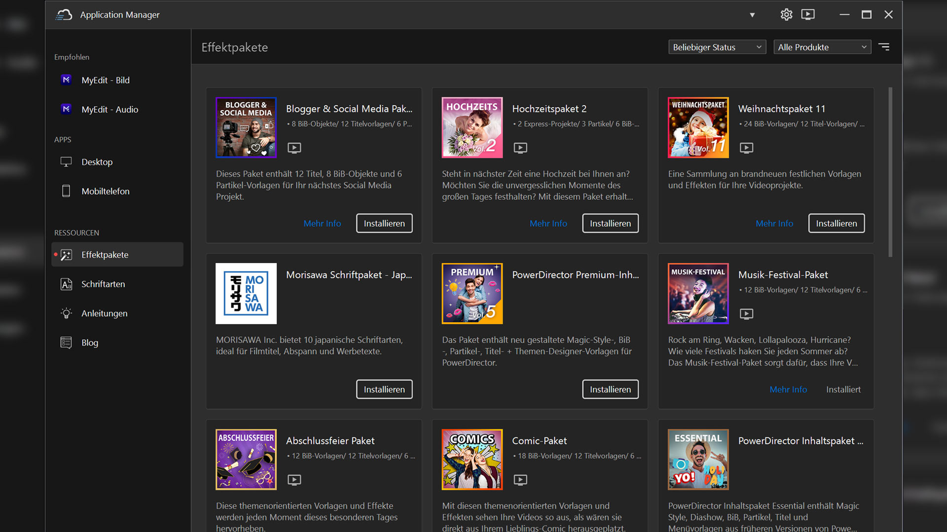 Der Cyberlink Application Manager ist das Zentrum für alle Cyberlink-Anwendungen. Darüber hinaus kann man zahlreiche Inhaltspakete und Erweiterungen für die Software herunterladen.