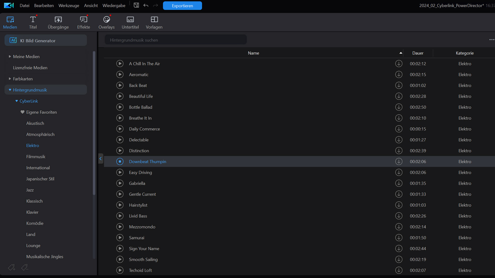 Sollte einmal Video- oder Audiomaterial fehlen, stellt PowerDirector seinen Nutzenden lizenzfreie Toneffekte, Musik sowie Bild- und Videomaterial zur Verfügung. Dabei greift PowerDirector auf die Bild- und Videodatenbanken von gettyimages und dessen Ableger iStock zurück. Bis zu 30 Premium-Inhalte pro Monat und unbegrenzt viele Standard-Inhalte stehen zur Verfügung, wobei CyberLink in der aktuellen Version die Suche in den Datenbanken verbessert hat und gleich in beiden Quellen sucht. Erstaunlich ist dabei vor allem die Anzahl an Videos, die enorm gewachsen ist. Besonders Landschafts- und Städteaufnahmen sind inzwischen reichlich vorhanden. Besonders gut gefällt zudem das Musik-Archiv mit enorm vielen Titeln und einer guten Möglichkeit die passende Hintergrundmusik über Filter zu finden.