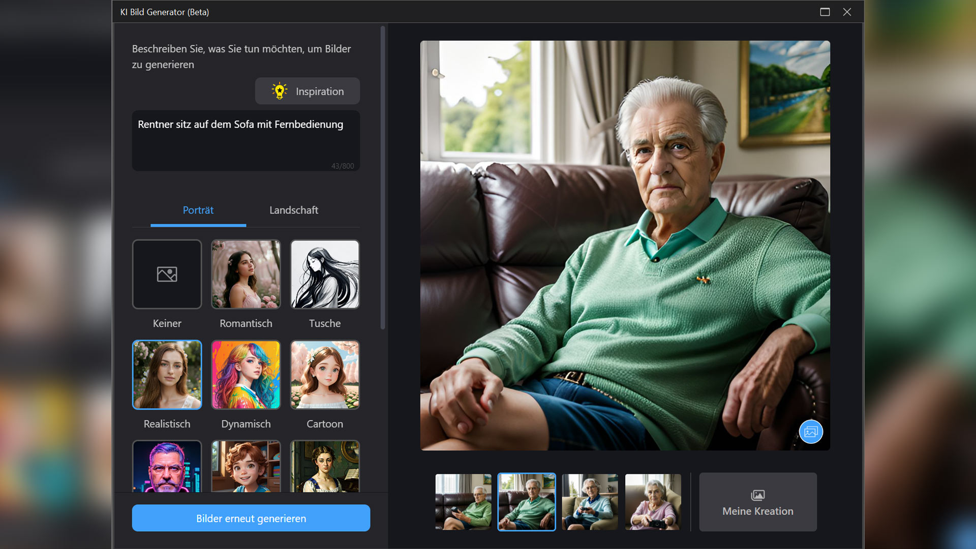 Der KI-Bildgenerator ermöglicht kostenlose Bildgeneration. Viele verschiedene Stile von realistisch bis kreativ sind verfügbar, die klassischen KI-Fehler wie unförmige Finger sind aber auch hier ein Problem.