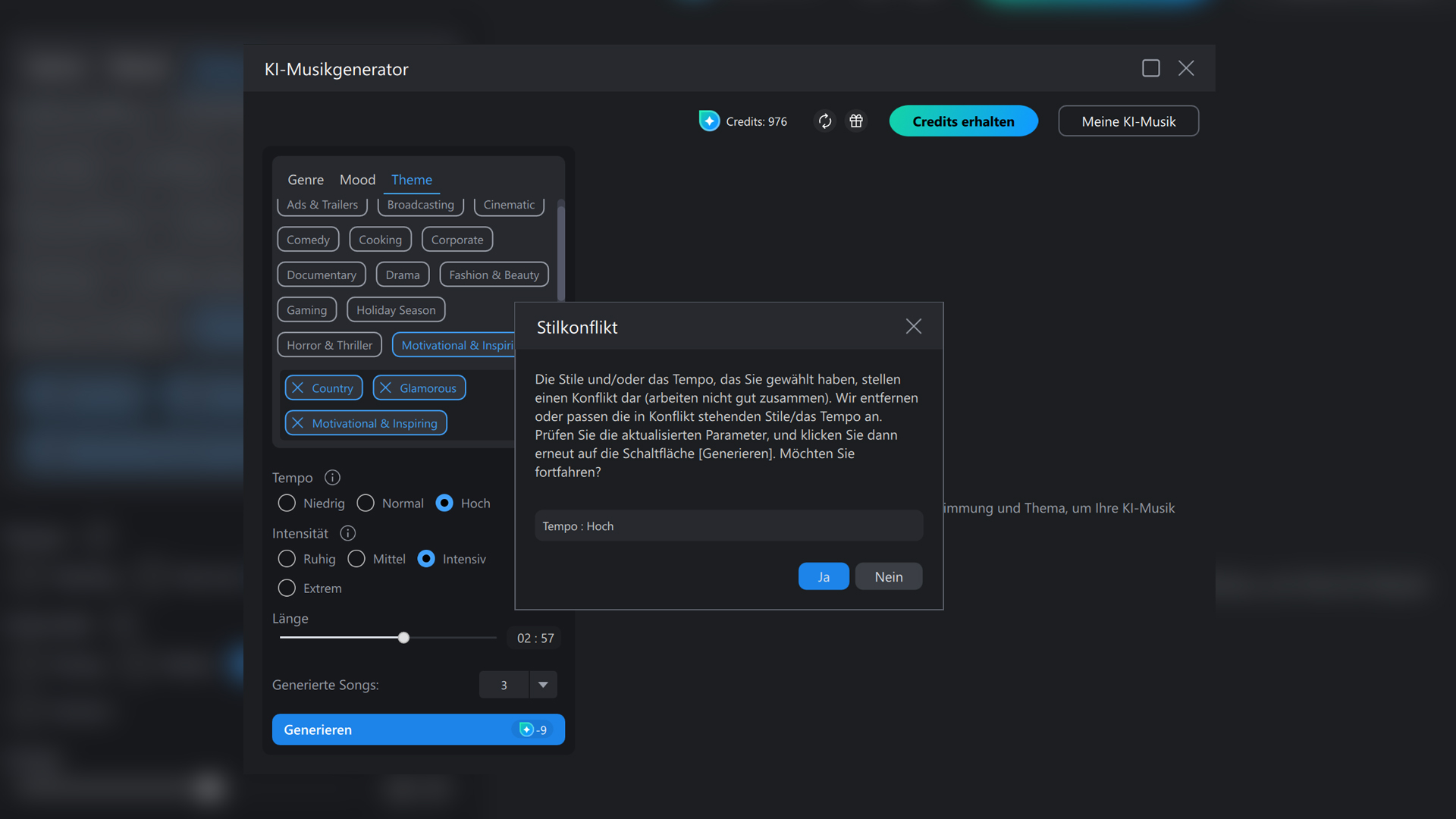 Tritt durch die ausgewählten Merkmale im KI-Musikgenerator ein Widerspruch auf, warnt das Programm davor und stellt auf Wunsch entsprechende Parameter um.