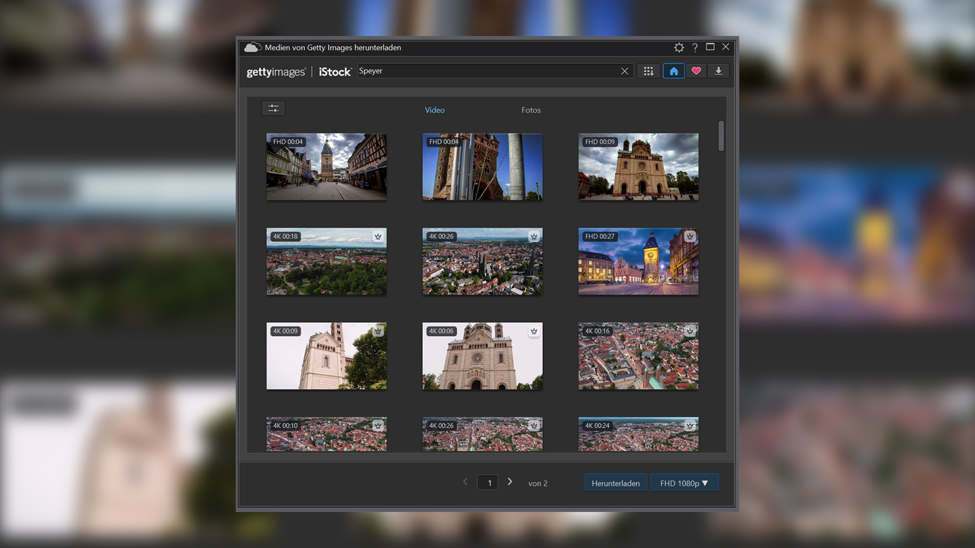 Die integrierte Bibliothek von Getty Images funktioniert auf deutsch problemlos und erfüllt auch speziellere Wünsche wie Schlangen im Wasser oder Ansichten aus Speyer.
