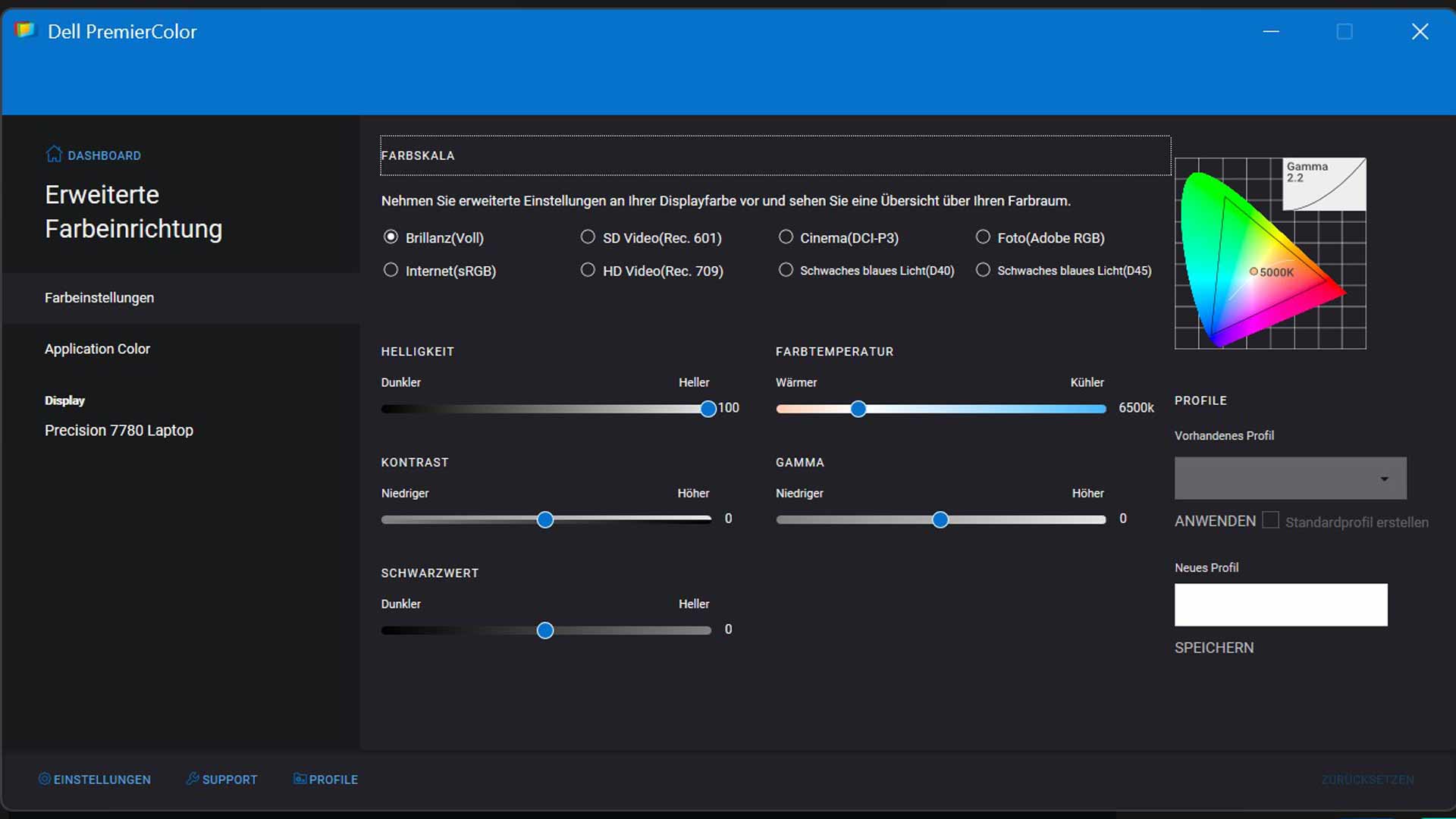 Standardmäßig steht das Display auf Brillanz, doch für den Videoschnitt ist Cinema oder HD Video sinnvoll und für die Fotobearbeitung Adobe RGB (Foto). Deshalb kann man die Profile unterschiedlichen Anwendungen zuordnen.