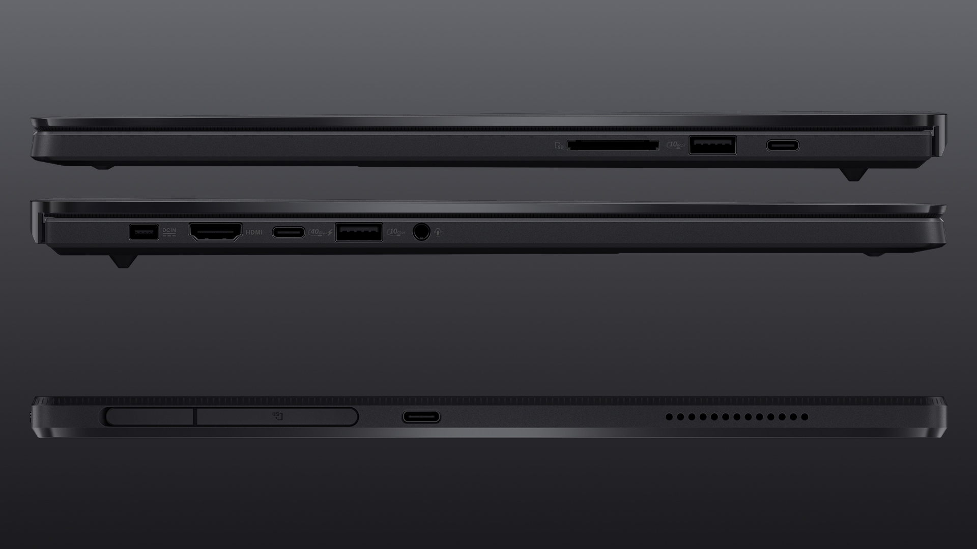 Während man beim Asus ProArt PZ13 (unten) mit lediglich einem USB-C-Port pro Längsseite sowie einem SD-Kartenslot leben muss, bietet der P16 (oben, beide Seiten abgebildet) mehr Anschlüsse.