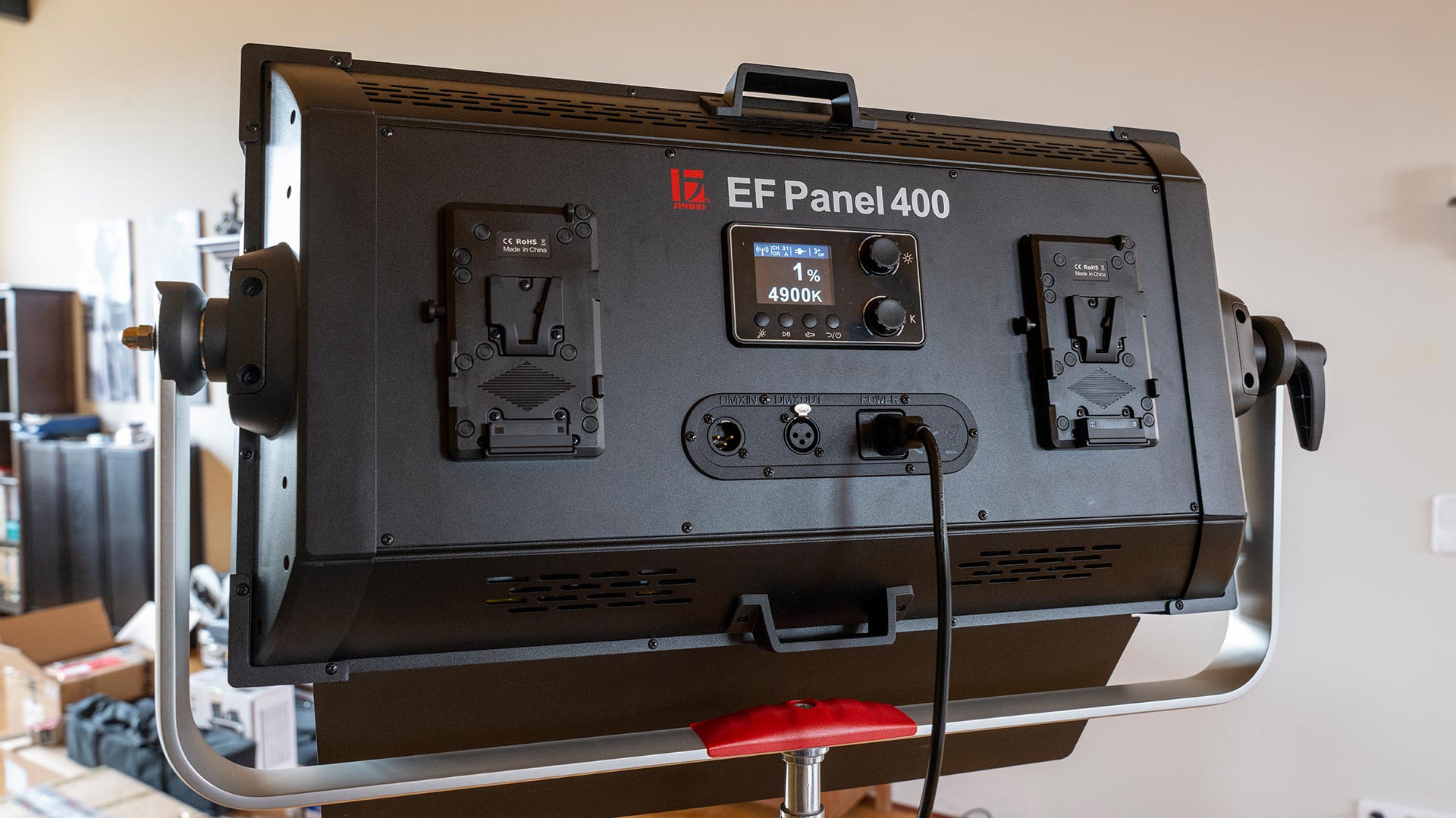 Die Jinbei lässt sich gleich mit zwei V-Mount-Akkus mit Strom versorgen und benötigt diese für volle Lichtleistung auch.