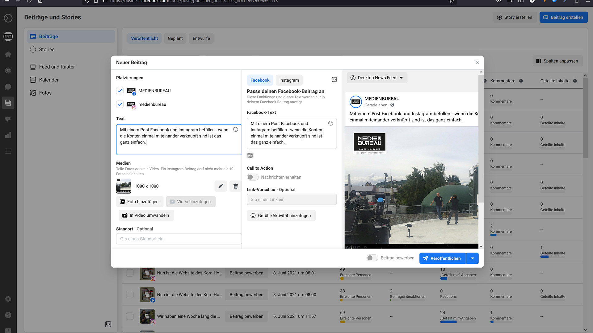 Facebook-Fanseiten lassen sich mit einem Instagram-Konto verknüpfen und anschließend aus der sogenannten Business-Suite in einem Arbeitsgang gleich zwei Posts für die zwei Portale erstellen.
