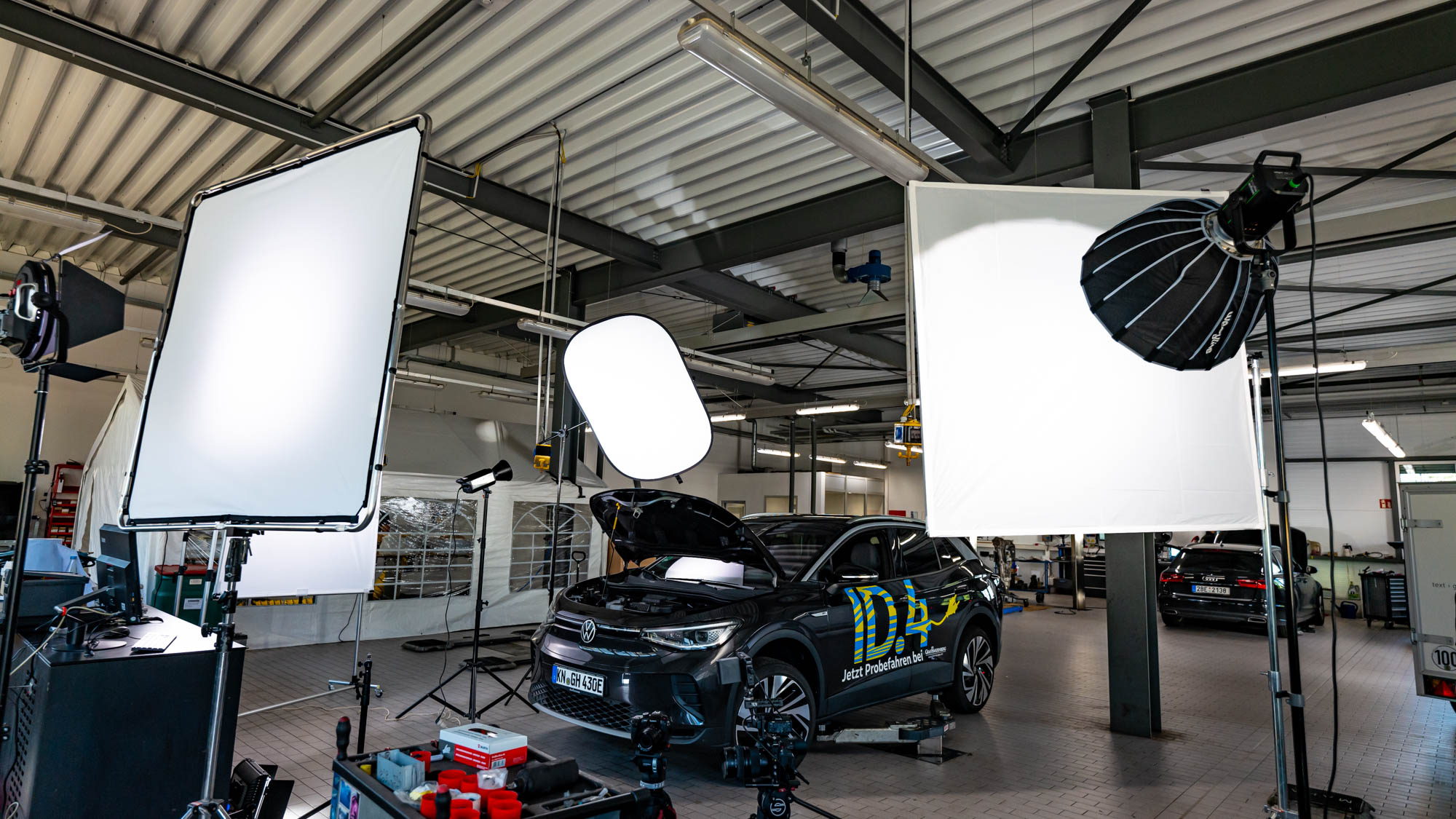 FAZITFür uns ist klar: An sonnigen Tagen führt in der Natur kein Weg um Diffusoren herum. Mit ihnen lässt sich das grelle Sonnenlicht abmildern und harte Schatten vermeiden. Dabei ist es oft vom Licht und dem eigenen Geschmack abhängig, welche Diffusoren-Stärke die bessere ist. Bei der Größe kann man ganz einfach festhalten: Größer ist besser – aber eben auch schwerer zu handhaben. Während der Manfrotto Halo Compact auch im kleinsten Setup noch Platz findet, nimmt das „Rollbare Reflektorpanel“ von Walimex so viel Platz weg, dass wir es in zwei Teilen im Anhänger transportieren müssen, wollen wir uns den nervigen Aufbau sparen. Einmal aufgebaut, ist es dafür sehr flexibel und schnell einsetzbar, was wiederum Zeit einspart. Dass Diffusoren nicht nur draußen im Sommer, sondern auch am Filmset dazugehören, zeigt das untere Bild: Hier drehten wir in einem Autohaus an einem Vorführwagen, der natürlich frisch gewaschen glänzte. Um störende Reflektionen zu vermeiden, arbeiteten wir mit geschicktem Einsatz von Diffusoren und Reflektoren. So konnten wir eine angenehme, weiche Lichtstimmung kreieren - ohne Diffusoren unmöglich.