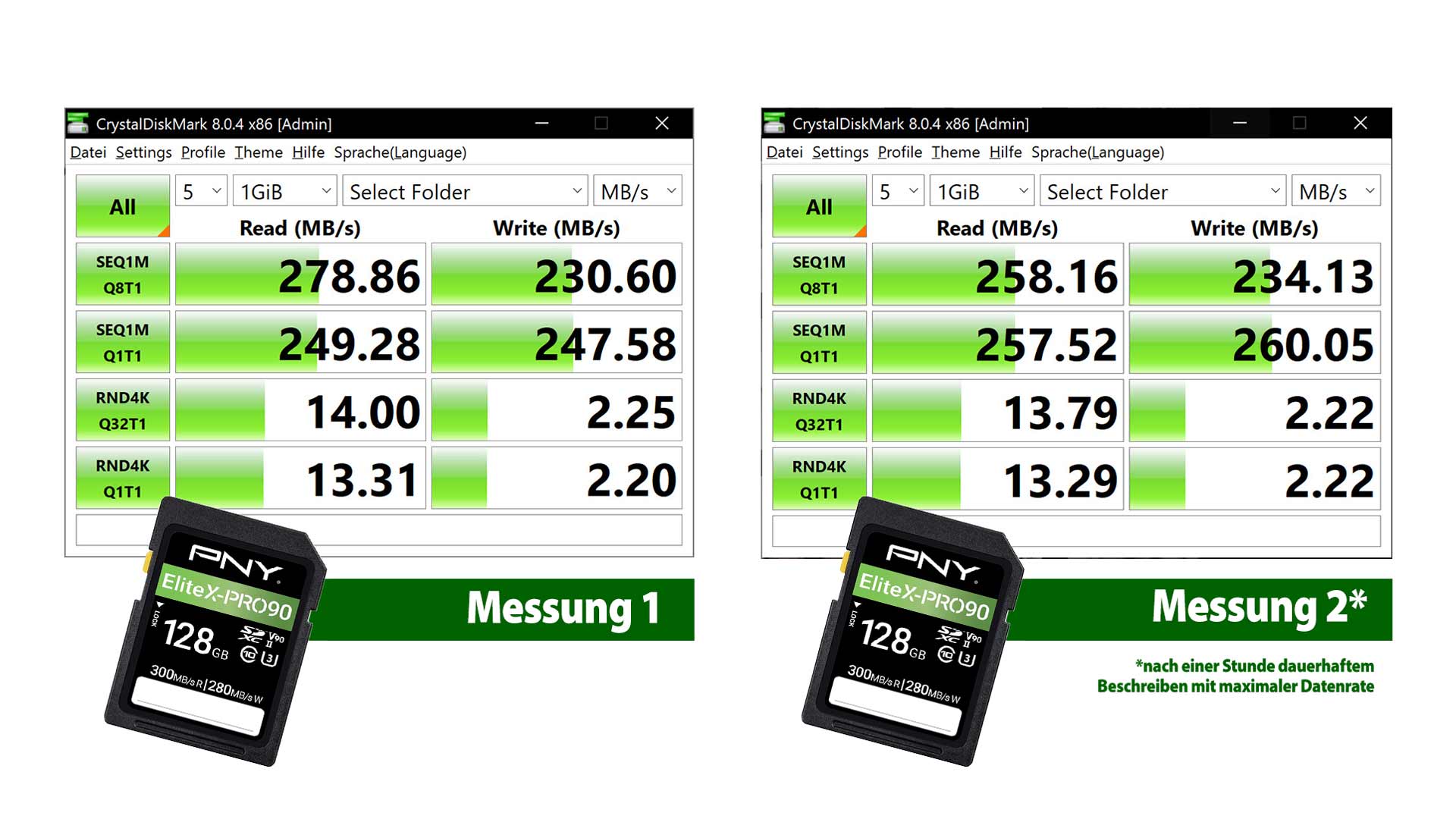 MESSWERTEFür die PNY lässt sich feststellen: Die von uns getestete Speicherkarte liegt relativ dicht an den auf der SD-Karte kommunizierten Werten: Beim Lesen waren das knappe 280 Megabyte/s während beim Schreiben die Differenz mit 230 Megabyte/s schon deutlicher daneben lag und die Datenrate der UHS-II-Schnittstelle nicht wirklich ausgereizt wird. Allerdings muss man PNY zugutehalten, dass diese Datenrate zuverlässig gehalten wird: Wir machen stets einen Test nach einer Stunde Dauerbelastung, denn gerade bei Flash-Speichern bricht bei steigender Wärmeentwicklung die Datenrate deutlich ein. Beim Lesen erreichte die EliteX-Pro90 hier dann noch eine Rate von knappen 260 Megabyte/s. Beim Schreiben erlebten wir hingegen interessanterweise nicht den vermuteten Einbruch, sondern eine stabile Datenrate, die sich sogar leicht über 230 Megabyte/s einpendelte.