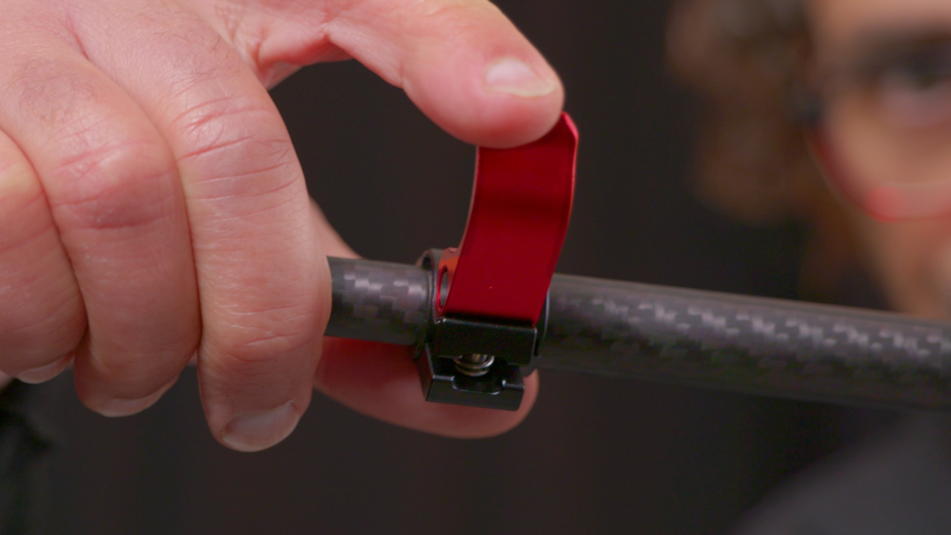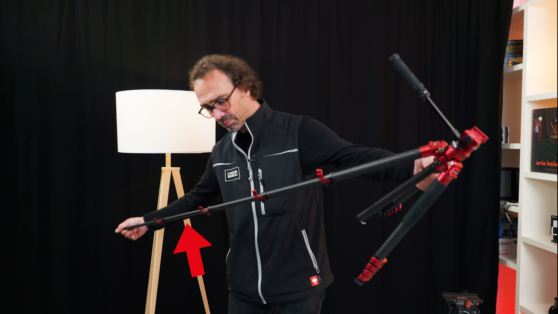 Insgesamt vier ausfahrbare Segmente hat jede Stütze. Das mit einem Pfeil markierte, zweitunterste Teilstück sollte man aber eingefahren lassen.