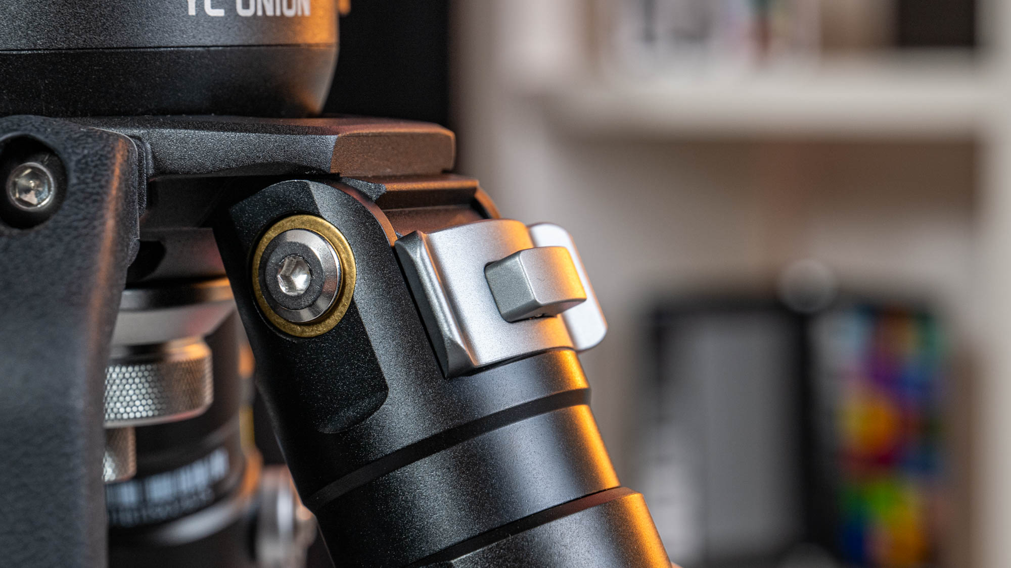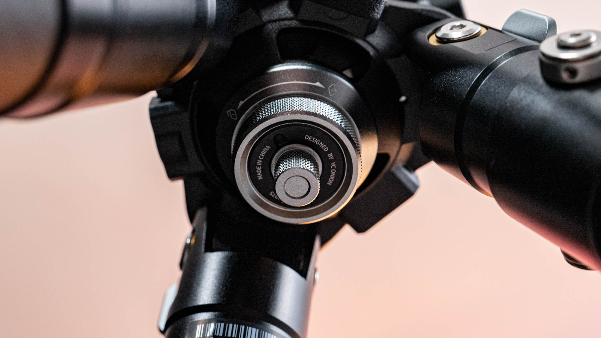Die Beine müssen nicht nur in der Höhe, sondern auch im Winkel verstellt werden und auch hier geht YC Onion offensichtlich den gleichen Weg wie Sachtler beim Flowtech: Es gibt in der Stativschulter eine Beinwinkelverstellung in drei Stufen. Allerdings funktioniert diese eher wie bei einem Fotostativ: zieht man die Verriegelung heraus, lässt sich das Bein frei bewegen, drückt man sie wieder herein, rastet das Bein beim nächsten Winkel ein. In der Mitte der Beinraster sind zudem Taster untergebracht, mit dem sich die Beine zum leichteren Transport im zusammengeklappten Zustand arretieren lassen.