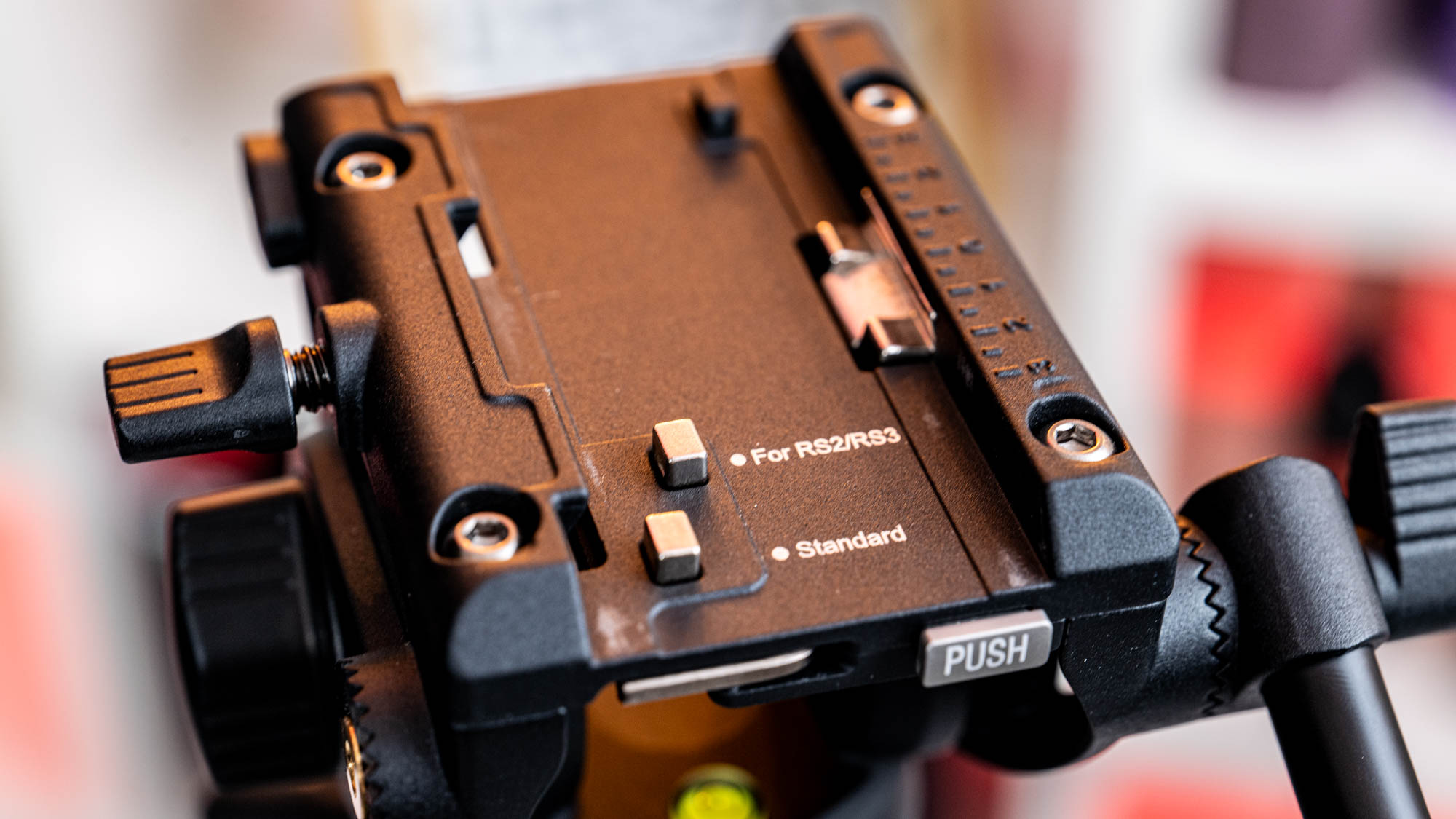 Bei der Verbindung zur Kamera setzt der Hersteller auf eine Schnellwechsel-Platte. Unten an de Kamera geschraubt, lässt sich diese links im Videoneiger ansetzen und löst beim Absetzen der Kamera auf dem Neiger die Verriegelung aus, so dass die Kamera auch ohne die Fixierung durch die linke Schraube schon mal sicher auf dem Kopf sitzt und sich die Stativplatte beim Finden der passenden Balanceposition noch gut verschieben lässt. Allerdings integriert YC Onion zwei Sicherungsstifte für unterschiedliche Stativplatten, was an für sich ein Vorteil, aber eben auch eine Fehlerquelle ist. Wer den Sicherungsstift für die RS2/3 oben hat, jedoch die Standard-Stativplatte verwendet riskiert, dass die Kamera nach hinten abrutschen kann.