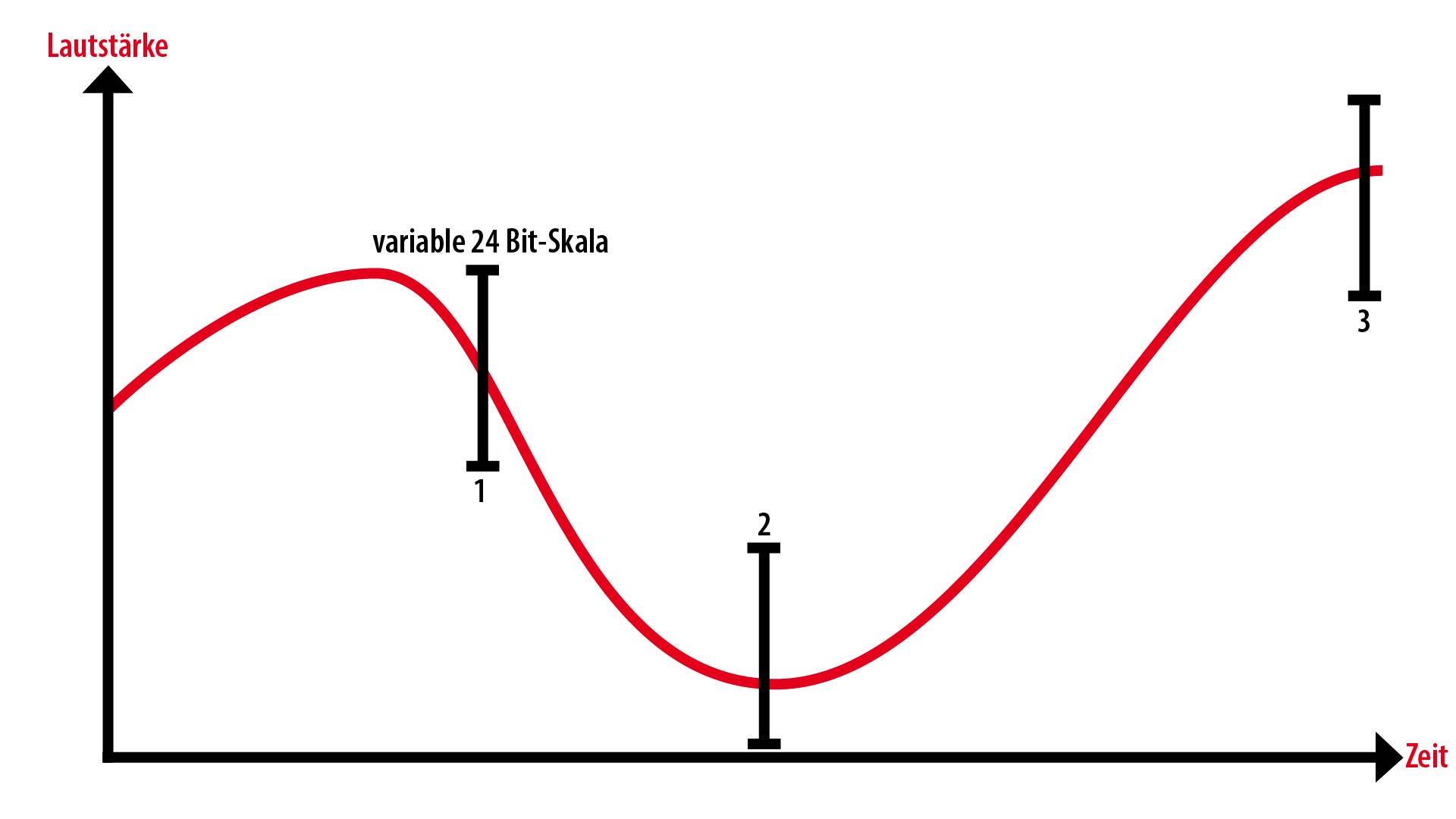 Wie in der Skizze erkennbar, verbirgt sich hinter 32 Bit-Technologie eine anpassbare 24 Bit-Skala. Dadurch ist in allen drei Positionen gewährleistet, dass das gewandelte Digitalsignal genug Abstand zum Grundrauschen und Übersteuerung hat.
