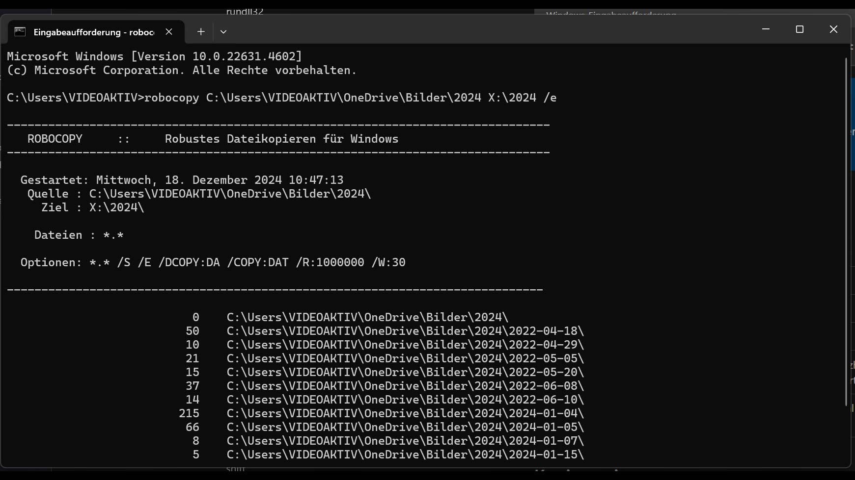 Von einem „Userinterface“ ist man bei der Eingabeaufforderung weit entfernt, doch mit dem robocopy-Befehl kann man zuverlässig Dateien und ganze Dateistrukturen kopieren.