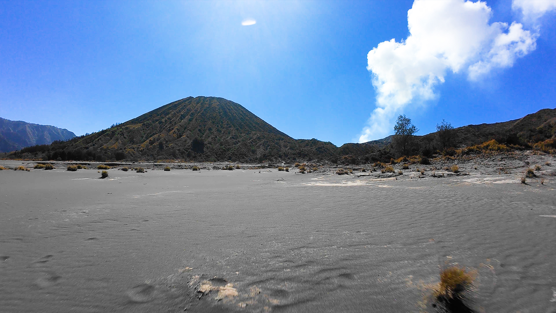 Innerhalb der Caldera des Tengger-Massivs liegen der Schlackenkegel Batok (links) und der Bromo-Krater (rechts, rauchend). Die Bildqualität der Avata 2 ist gut und liegt ungefähr auf dem Niveau der Mini 4 Pro oder der neuen Flip-Drohne.
