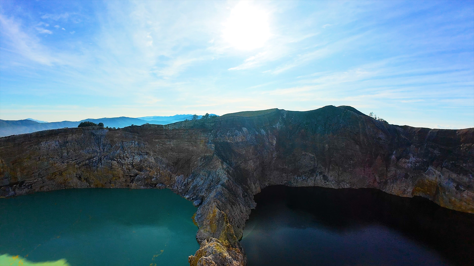 Erster Drehort war der Kelimutu mit seinen charakteristischen drei Kraterseen. Mit der Avata 2 sind Kamerafahrten direkt entlang der steilen Kraterwände möglich.