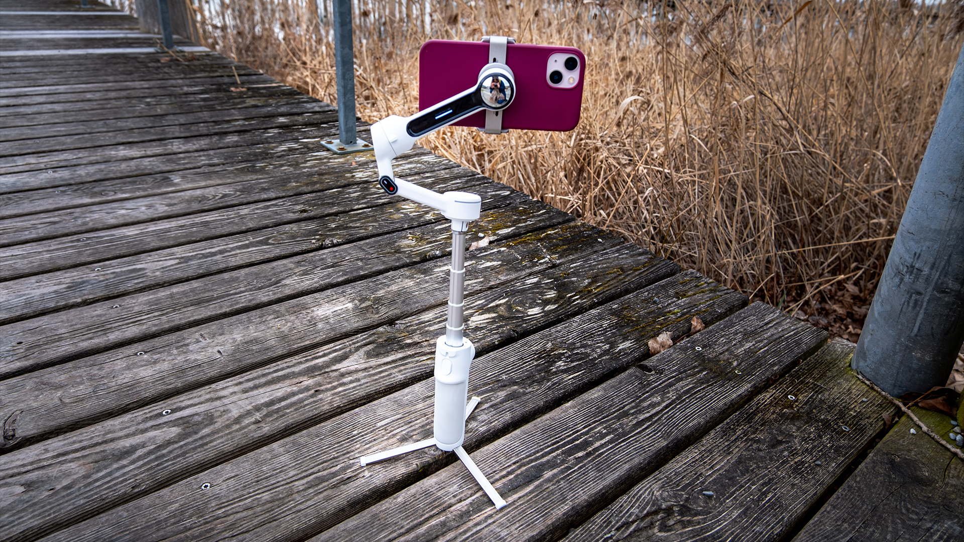 Erhältlich ist das Flow 2 Pro in Hellgrau und Schneeweiß sowie in vier verschiedenen Bundles. Das Standard-Bundle für 170 Euro enthält das Gimbal, eine magnetische Smartphone-Klemme, ein USB-C-zu-USB-A-Ladekabel und eine Schutztasche. Für 200 Euro gibt es das KI-Tracker-Bundle, das zusätzlich den KI-Tracker enthält – ein praktisches Zubehör, das für uneingeschränktes Tracking auf verschiedenen Smartphone-Modellen sorgt. Ebenfalls für 200 Euro ist das Creator-Bundle erhältlich, das neben der Standardausstattung ein Spotlight sowie eine magnetische Smartphone-Halterung für das iPhone bietet. Wer stattdessen eine Rucksackhalterung bevorzugt, findet diese im Vlog-Bundle für 213 Euro. Alternativ kann man den KI-Tracker, das Spotlight sowie die verschiedenen Halterungen auch einzeln erwerben. Wir hatten das Creator-Bundle im Test und schnell fällt auf, dass die magnetische Smartphone-Halterung für Android-Nutzer durch das fehlende MagSafe nicht nutzbar ist.