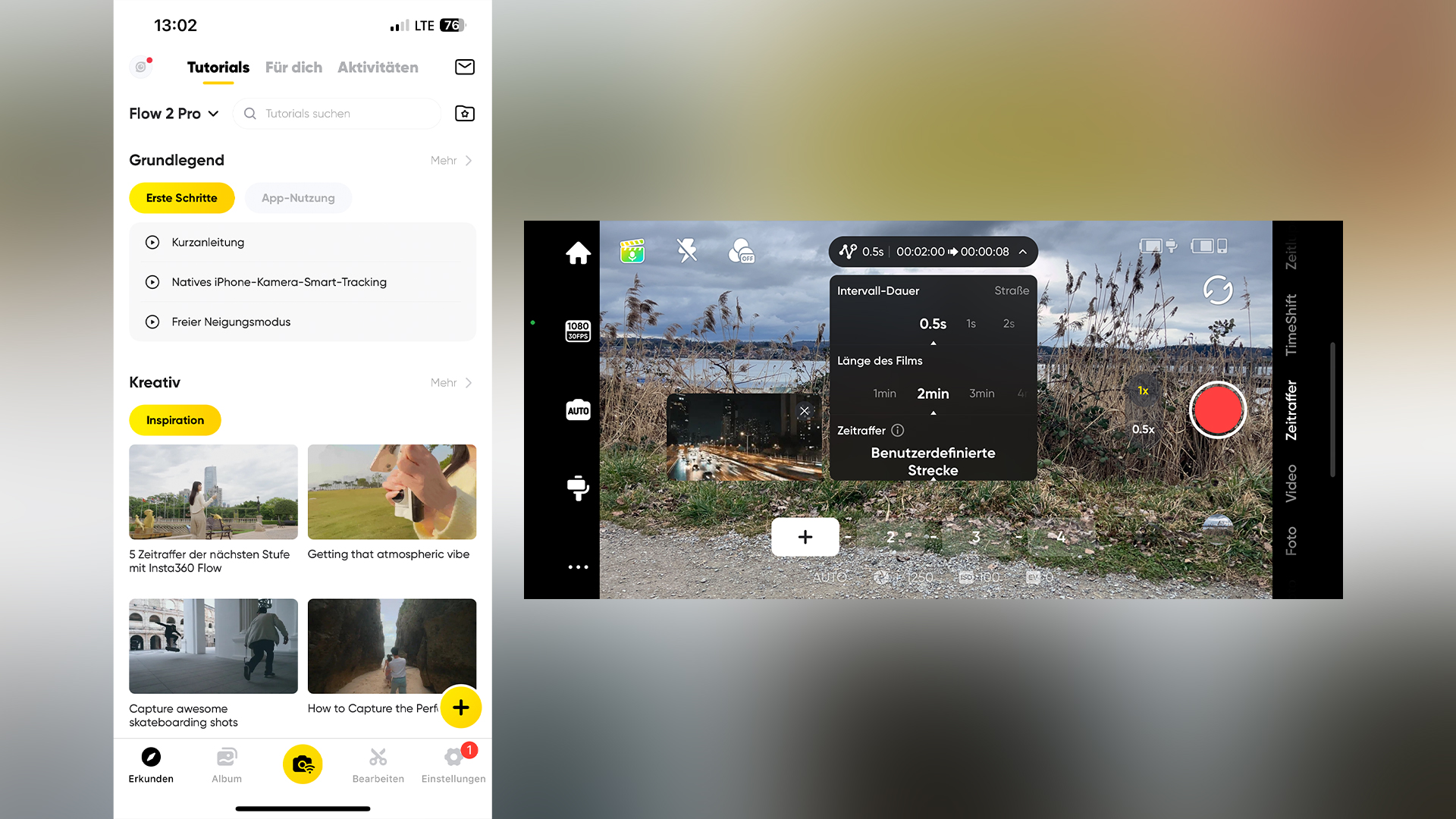 Im Zeitraffer-Modus ist es möglich, die Intervall-Dauer, die Länge des Films und sogar eine selbstdefinierte Strecke festzulegen. Zudem bietet die Insta360-App kurze Inspirationsvideos, sobald man auf eine Funktion klickt.