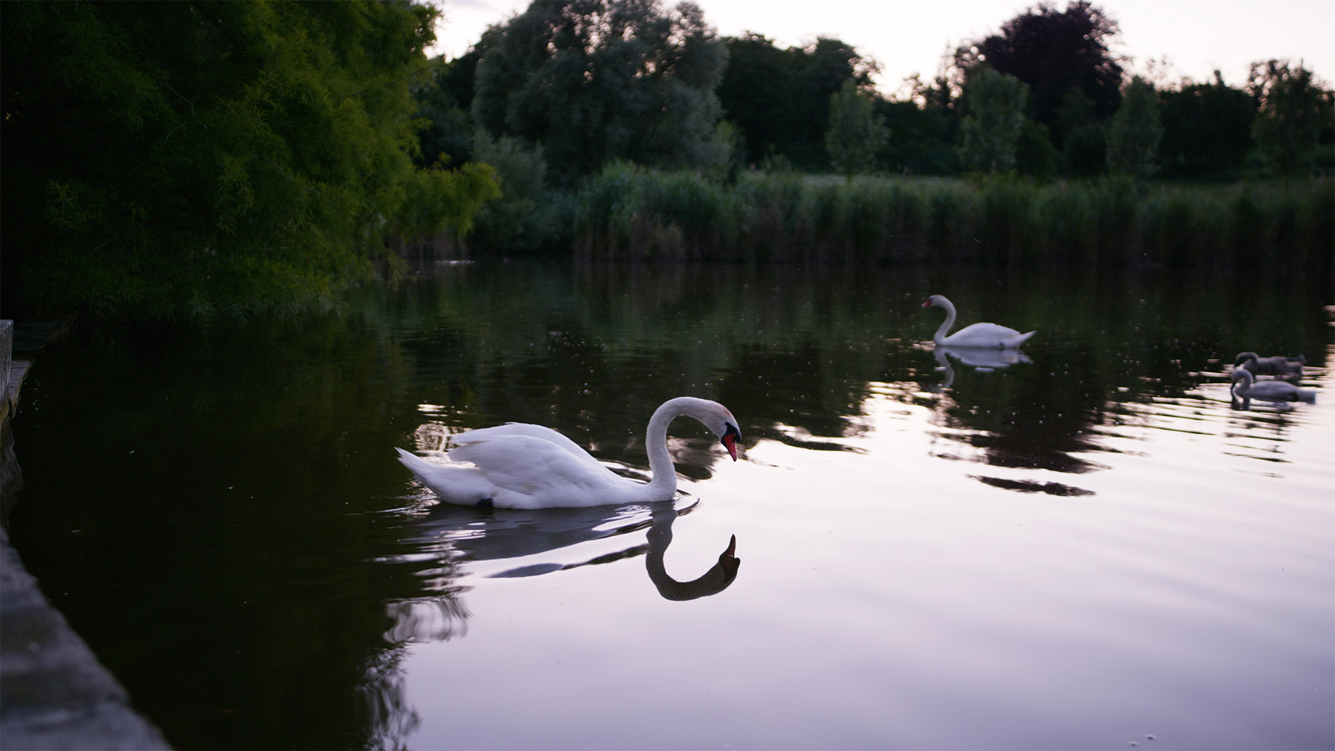 Wir wollten schon enttäuscht unsere Ausrüstung zusammenpacken, als die Hauptdarsteller doch noch eintrafen: Aus dem benachbarten Wohngebiet staksten die Schwaneneltern mitsamt drei flauschigen Küken die Wiese entlang zum Weiher. Nun hieß es schnell sein! Doch weil die Schwäne offensichtlich an Menschen gewöhnt waren und uns sehr nahe an sich heranließen, entstanden schnell schön aneinandergereiht eine kleine Geschichte erzählende Aufnahmen, bei denen das Objektiv dann seine ganzen Stärken ausspielte. Der feine Regelweg des Schärferings ließ trotz hohem Widerstand ein genaues Schärfeziehen zu, und in Kombination mit der Panasonic S1H - als ohnehin schon lichtstarker Kamera und mit großer Blende - sehen die Einstellungen eher nach frühem Abend, als nach einer Aufnahmezeit jenseits von 21 Uhr aus.