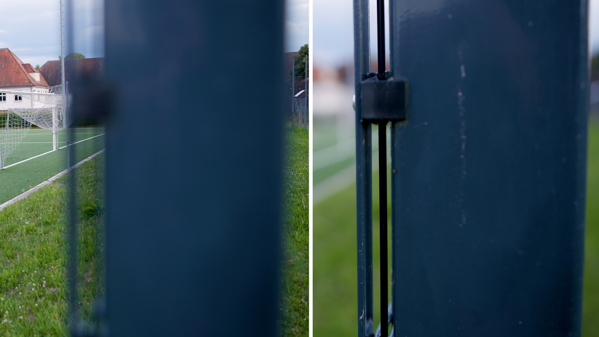 Das Fokusatmen ist nicht wegzudiskutieren: Liegt die Schärfe im Hintergrund, ist am rechten Bildrand ein breiter Streifen Gras zu sehen (links). Liegt der Fokus auf dem Pfosten im Vordergrund, ist vom breiten Streifen nur noch ein schmaler Strich geblieben (rechts).