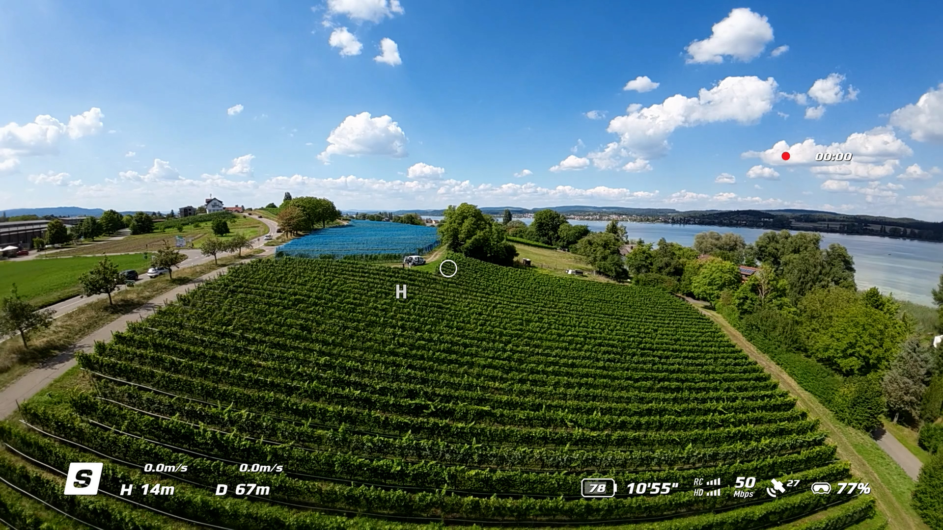 Das Display informiert über den Modus (in diesem Fall S, für Sport) die Flughöhe und Distanz und zeigt die verbleibende Flugzeit an. Der runde Kreis zeigt den anvisierten Punkt zu dem die Drohne fliegt – unschwer zu erkennen: Das war die Startbasis, die man permanent auch am eingeblendeten „H“ eingeblendet bekommt.