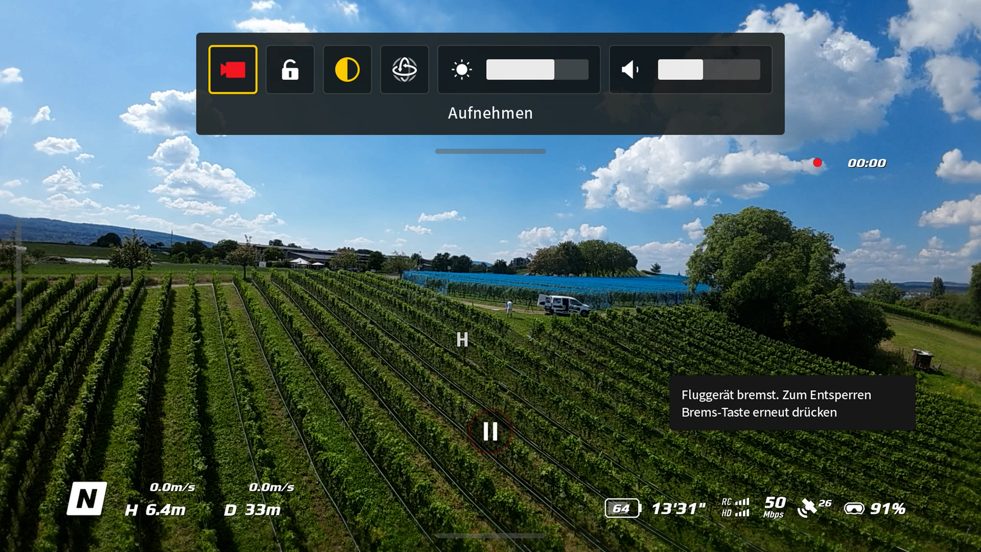 Mit dem Bremsknopf am Handkontroller kann man die Drohne in der Luft „festnageln“ so dass man sich um die Kameraeinstellungen kümmern kann. Das Quickmenü bietet zudem wichtige Funktionen der Goggles 2 an.