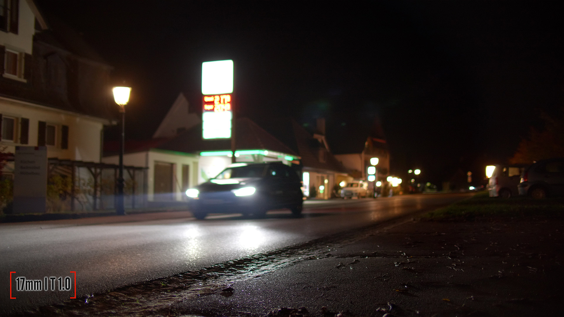 Auch sollte man aufpassen, dass die Lichtquellen nicht direkt in die Linse strahlen, denn alle drei Mitakons neigen zu drastischem Lens Flare. Gerade bei Offenblende tritt schnell ein extrem großer matter Lens Flare auf, was wenig elegant sondern nur störend aussieht. Während Nachtaufnahmen strahlte das Licht einer nahen Straßenlaterne wie eine Sonnenkorona in die äußeren Bildbereiche, je nach Winkel traten zudem deutliche Flecken auf. Bei vorbeifahrenden Autos ist die Korona zwar weg, die Flecken blieben aber. Eine Matte-Box sollte also auf jeden Fall mit eingeplant werden. Zudem muss man mit einem deutlichen Fokusatmen beim 25- und 35mm-Objektiv leben. Beim 17mm-Mitakon konnten wir hingegen nahezu kein Fokusatmen auszumachen.