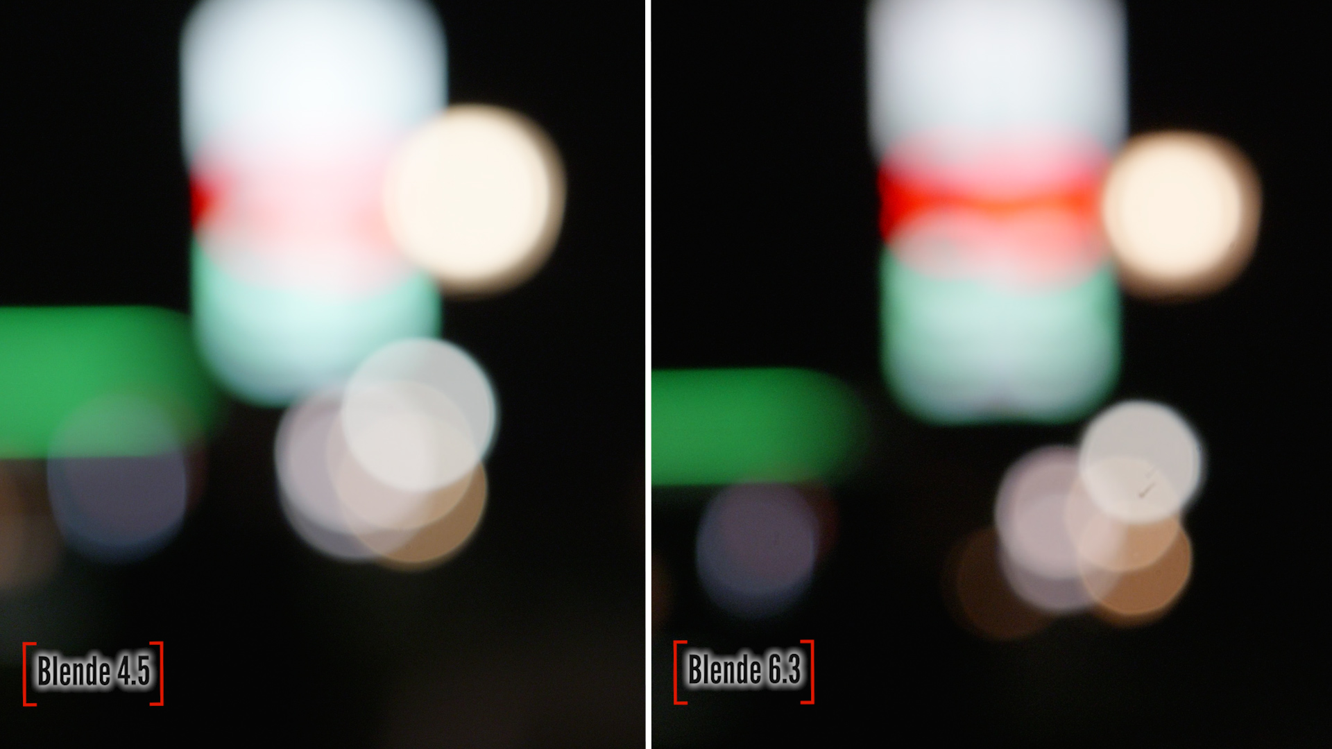 Die Bokehs der beiden Offenblenden bei 60 respektive 600 Millimetern Brennweite unterscheiden sich deutlich. Während bei Blende 4.5 das Bokeh zweifelsfrei rund ist, treten bei Blende 6.3 deutliche Ecken und Kanten auf.