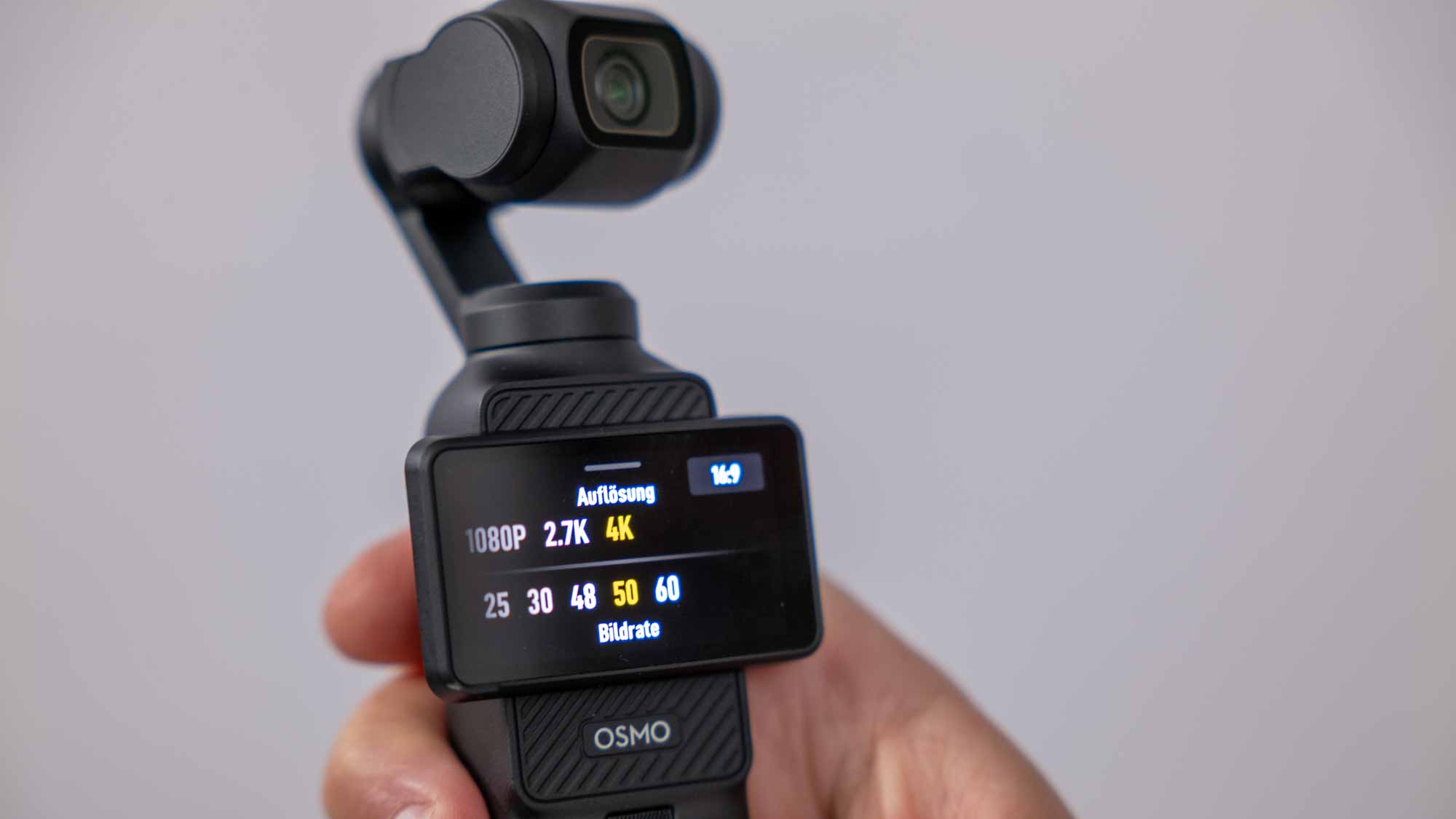 Wobei die kleine Osmo Pocket 3 eben nun auch mit einem Dreh am 2-Zoll-großen Display einschaltet, und wenn man es im Menü angewählt hat, nicht nur die Kamera auf dem Gimbal ausrichtet, sondern gleich in den Aufnahmemodus geht. Das nun deutlich größere Display ist dennoch immer noch nicht groß, lässt nun aber zumindest halbwegs die Bildbeurteilung zu. Größer ist der Fortschritt im Menü, das sich nun deutlich komfortabler bedienen lässt. Dennoch muss man recht genau mit dem Finger auf dem Touchscreen zielen, um den richtigen Menüpunkt auszuwählen. Dass dies hier nicht immer klappt ist lästig, aber nicht schlimm. Deutlich unangenehmer ist das, wenn man zum Beispiel das Gimbal mit dem kleinen Symbol im unteren rechten Eck des Bildschirms in den Selfie-Modus drehen lassen will, stattdessen hier aber den Schärfepunkt hin verlagert. Mit einem Wisch von links nach rechts kommt man in die Bildeinstellungen, wo Kameraleute nun das flache D-Log M-Profil mit 10-Bit-Farbtiefe auswählen können. Aufgezeichnet wird so maximal in UHD-Auflösung mit 30 Bildern in der Sekunde. Erst nach dem Wechsel in den Normalmodus, stehen dann sind bis zu 60 Bildern in der Sekunde zur Verfügung.