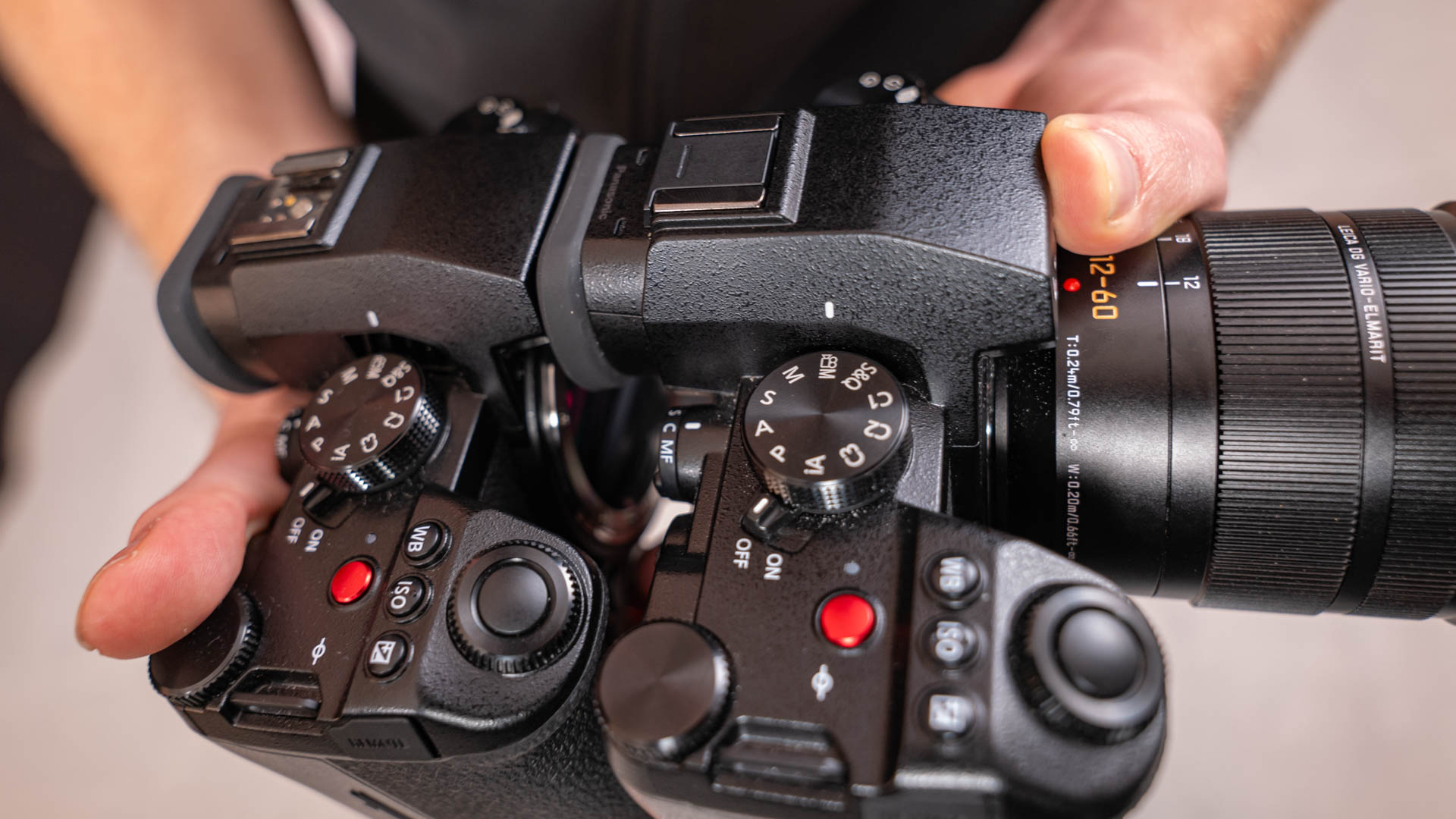 Wenn Panasonics GH6 und S5II ein Kind hätten, dann sähe es wohl aus wie die G9II. Diese benutzt ebenfalls einen 25,2-Megapixel-Sensor wie die GH6, sieht aber der Vollformat-Verwandtschaft zum Verwechseln ähnlich – oder, um es kurz zu machen, die G9II benutzt das gleiche Gehäuse. Nur an zwei Stellen hat Panasonic Änderungen vorgenommen: Auf der Frontseite sitzen statt einem nun zwei frei belegbare Knöpfe und die aktive Kühlung wurde eingespart. Um es vorwegzunehmen: Sorgen wegen Überhitzung muss man sich im Drehalltag trotzdem nicht machen. Wir hatten die G9II sowohl bei langen Drehs als auch in einem einstündigen Webinar als Webcam eingesetzt und mehr als handwarm wurde die Kamera in keinem Szenario. Die Wahl des Gehäuses bedeutet allerdings auch, dass man im Vergleich zur ursprünglichen G9 auf das Schulterdisplay verzichten muss. An dessen Stelle ist das Modus-Wahlrad gerückt.