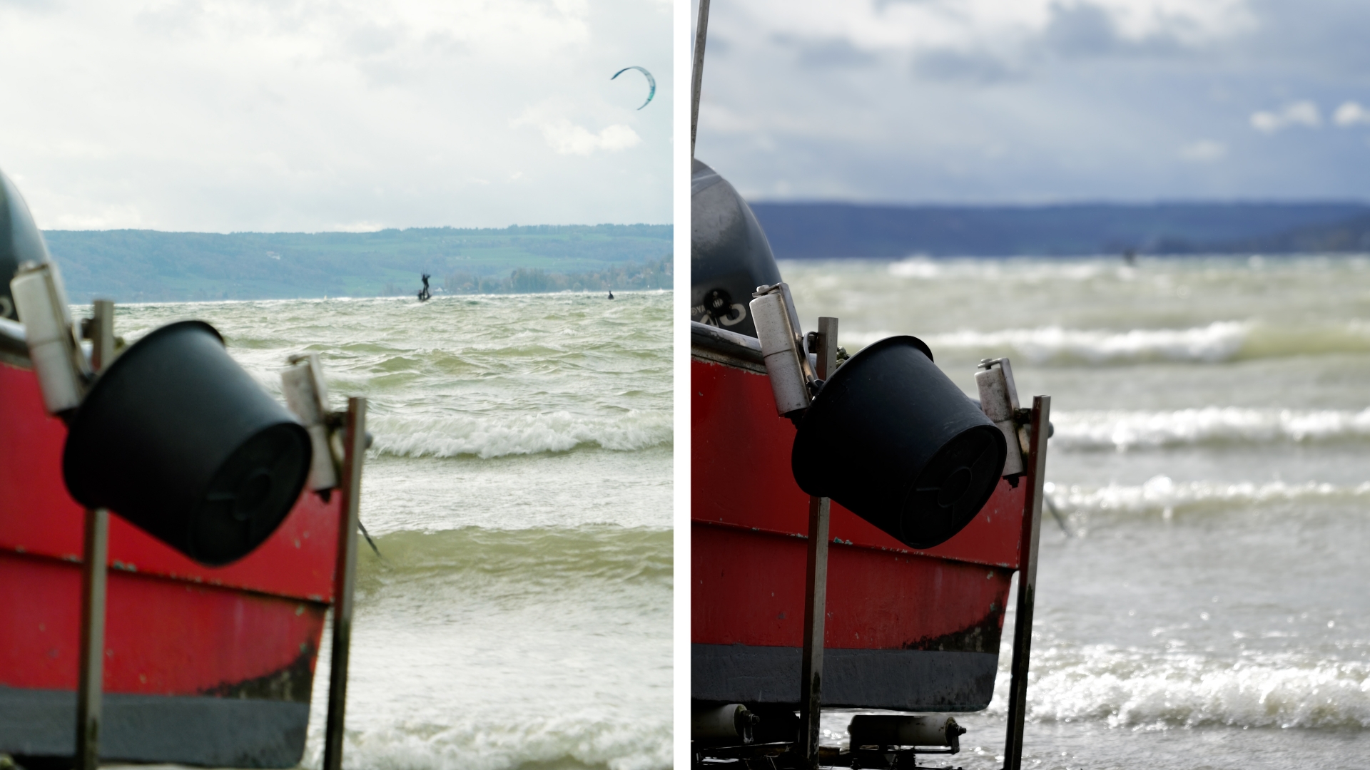 Die MFT-Kamera zeigt bei leicht geschlossener Blende bereits einen Schärfebereich bis in die Tiefe, wo die Vollformatkamera bei gleicher Blende noch Wasser und Surfer im Hintergrund verschwimmen lässt.