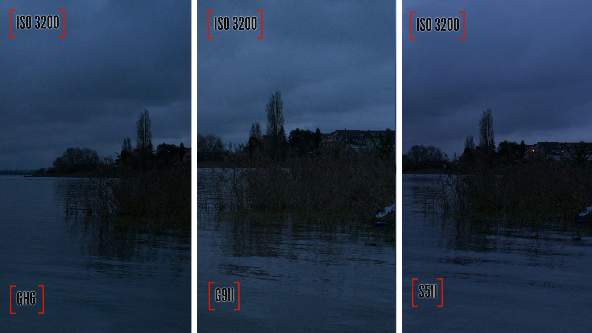 ISO-EmpfindlichkeitenEin Haken beim Filmen mit Log-Profil ist bei allen Kameraherstellern, die gestiegene Empfindlichkeit, die dazu führt, dass man sehr schnell mit ND-Filtern nachhelfen muss, damit man mit Offenblende und somit geringer Schärfentiefe filmen kann. Die GH6 hat eine native Empfindlichkeit von ISO 250, so dass sie hier die geringsten Probleme hat und zumindest bei bedecktem Himmel durchaus noch ohne ND-Filter mit der größten Blendenöffnung filmen kann. Bei der G9M2 mit ihren ISO500 als niedrigste ISO-Empfindlichkeit beim Filmen mit V-log, geht das schon nicht mehr. Der Vollformatsensor der S5M2 bietet zwar zwei native Empfindlichkeiten, doch hier ist die untere mit ISO 640 bereits höher. Als klaren Pluspunkt kann man aber die zweite native Empfindlichkeit von ISO 4000 sehen, die zwangsläufig zu besseren Schwachlichtempfindlichkeit führt.