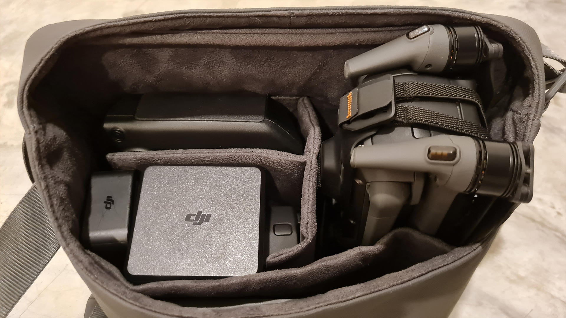 Drohne, Fernbedienung und Akkus passen in die Umhängetasche, sodass die Drohne überall hin mitgenommen werden kann.