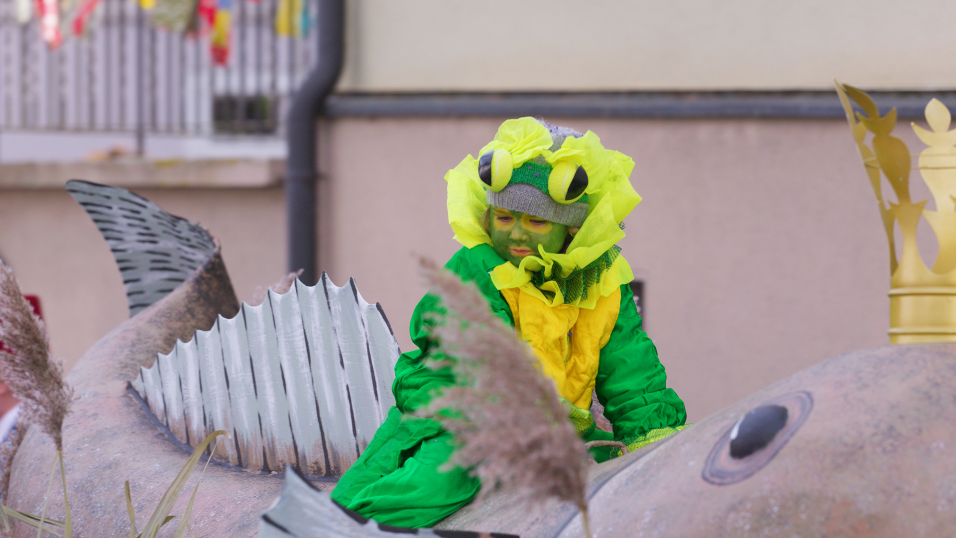 In dieser Aufnahme sitzt der Fokus exakt auf dem Gesicht, doch in der Bewegung komm ein kleiner Wedel vom Fasnachtswagen kurz vor den unteren Teil des Gesichts und bringt den Autofokus aus dem Tritt.