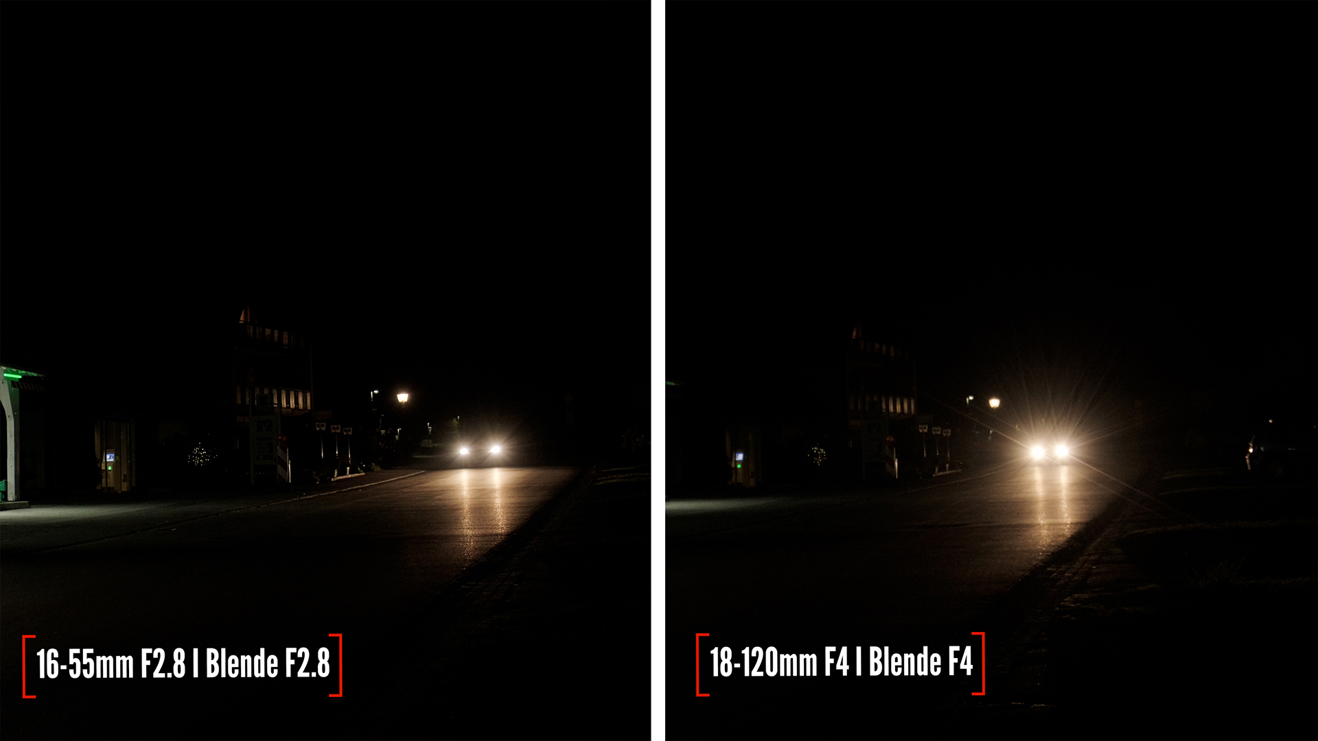 Mehr Zoom bedeutet mehr verbaute Linsen und damit auch einen stärkeren Lens Flare. Das bedeutet stärkere Lichtreflexionen und einen milchigen Effekt um Gegenlichtquellen, wie hier die Frontscheinwerfer des Autos.