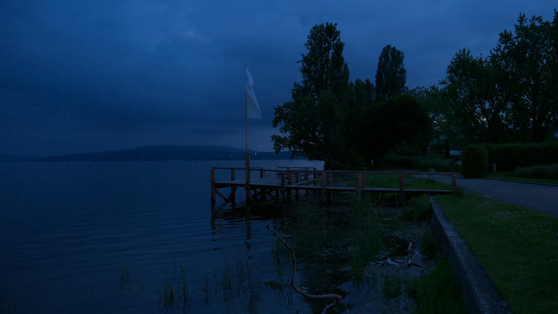 Das Standbild zeigt in den Wasserbereichen unterhalb des gegenüberliegenden Ufers sowie im Himmel über den Hügeln schon sehr deutliches Rauschen. Um die Fahne wird zudem ein Verlust an Schärfe deutlich.