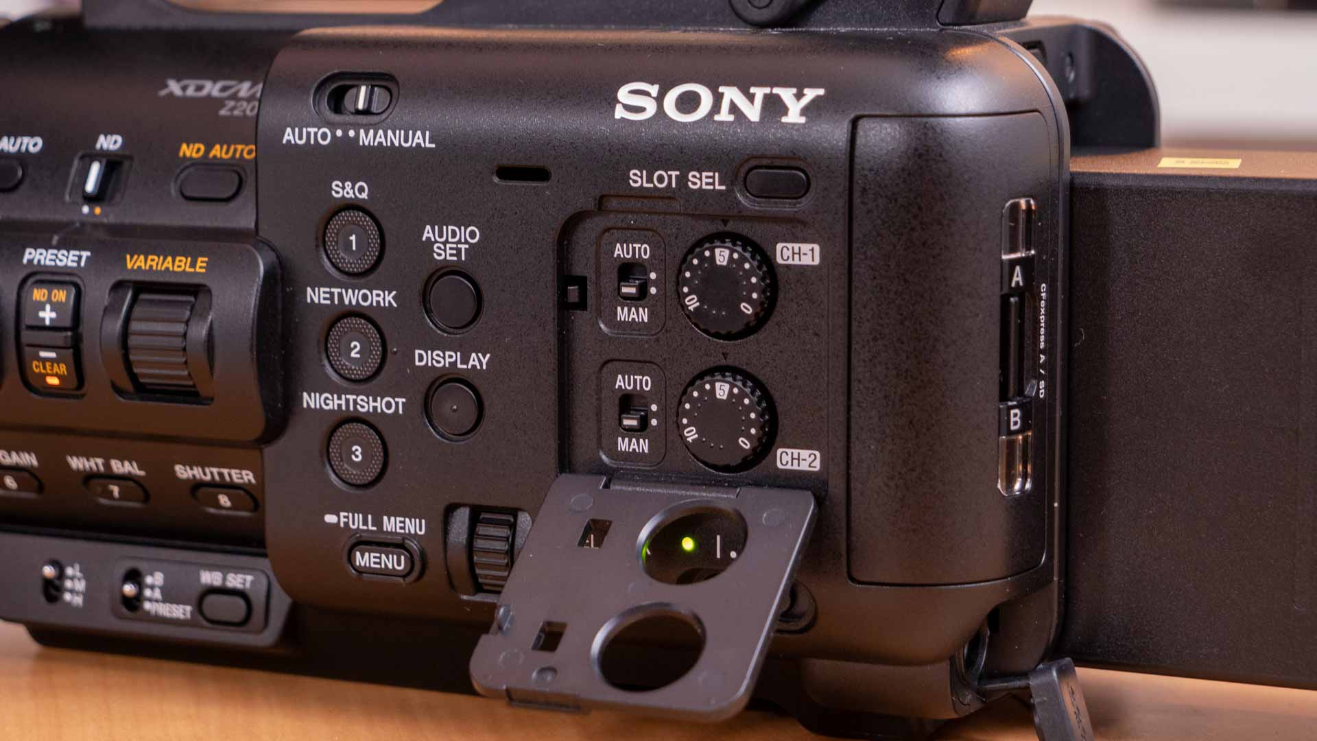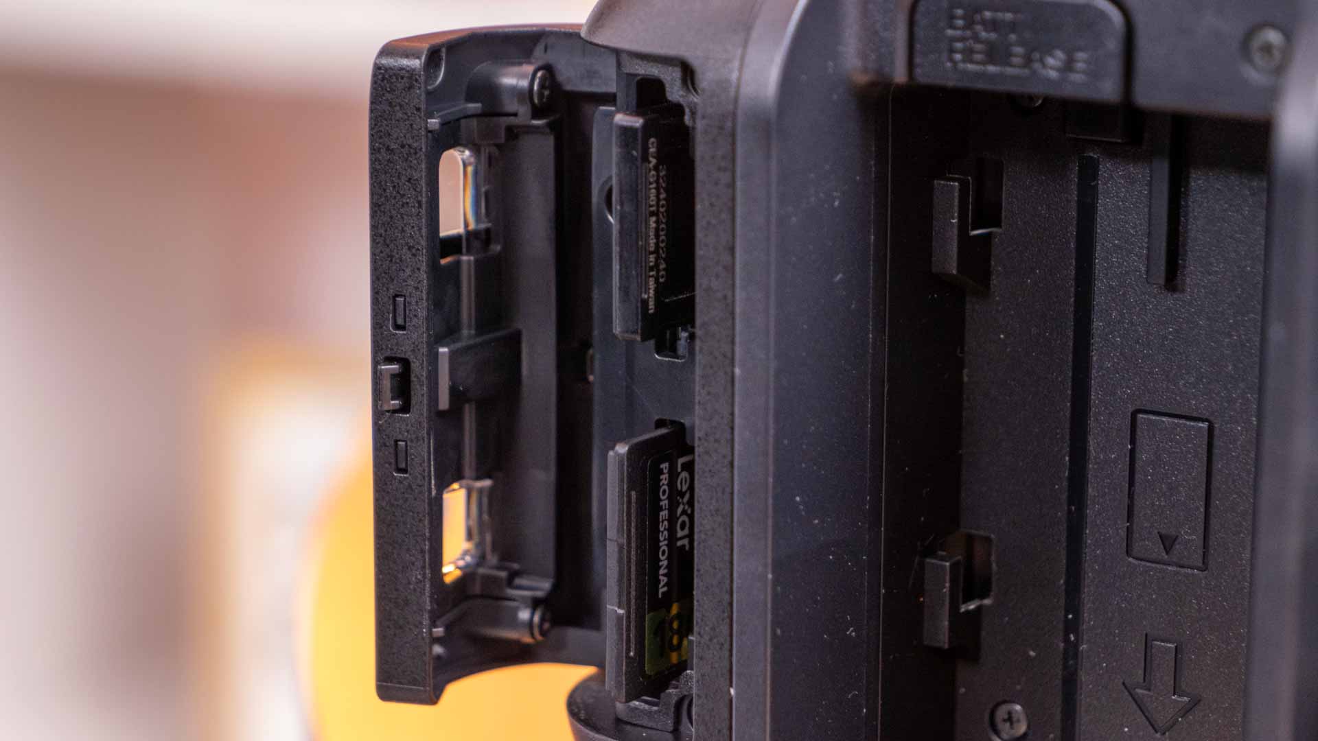Der PXW-Z200 hat zwei Kartenschächte, die sowohl CFexpress Typ-A oder SD-Karten aufnehmen. Somit ist hier das parallele Speichern auf zwei Karten machbar.