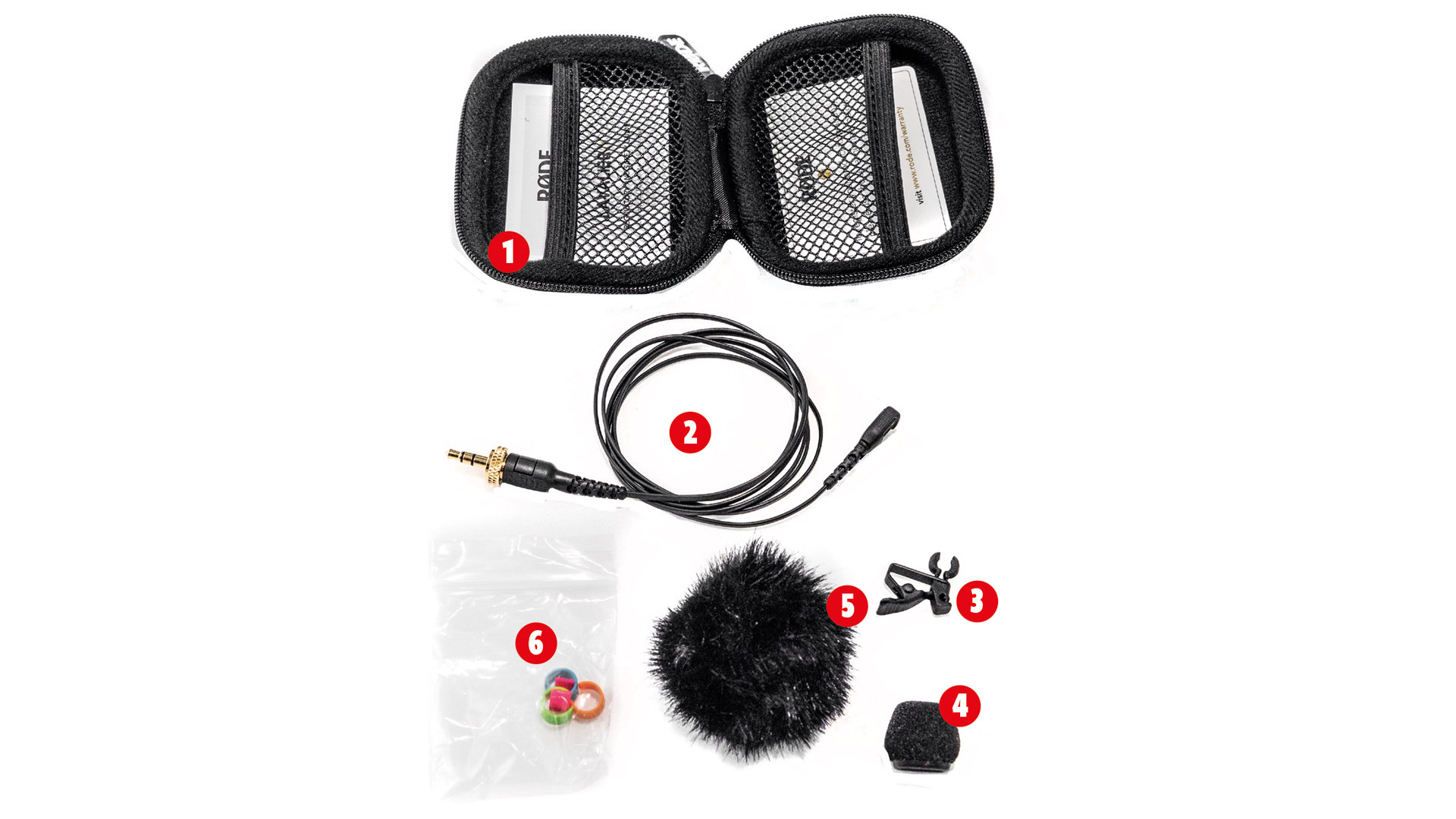 Im Transport-Etui (1) stecken neben dem Lavalier II mit Schraubverschluss-Kabel (2) eine Clip-Halterung (3), ein Kunststoff-Windschutz (4), ein Fell-Windschutz (5) so1 wie Farbcodier-Ringe (6).