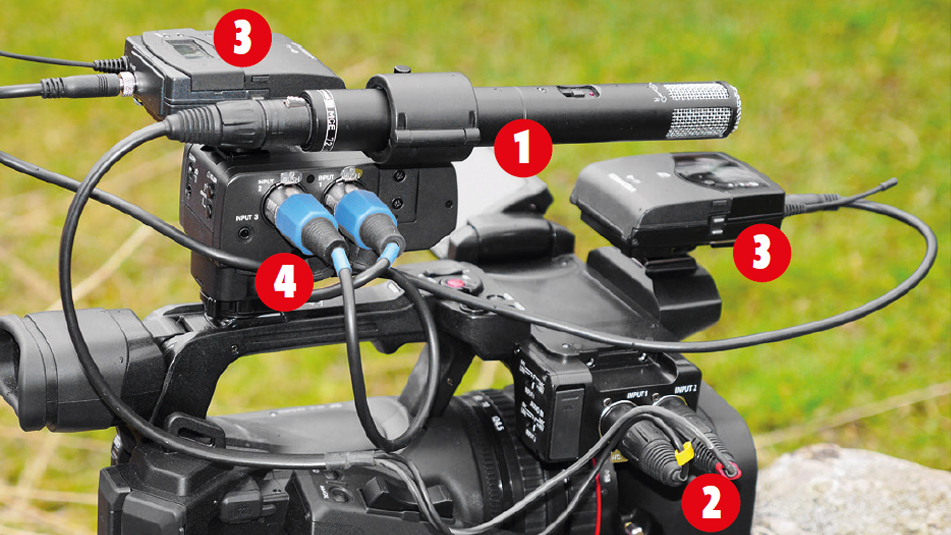 Echtes 4-Spur-Recording mit vier XLRTonquellen – das kann derzeit mit dem Tascam-Adapter nur Canons 4K-UHDCamcorder XF605. Hier verteilen sich die vier Spuren auf ein Stereomikro (1), angeschlossen an die zwei XLR-Buchsen (2) des Camcorders, und zwei Funkempfänger (3), die an den XLR-Buchsen der Combo-Eingänge (4) am Tascam CA-XLR2d-C hängen. Wenn nötig lassen sich sogar alle vier XLR-Kontakte mit Phantomspeisung versorgen; zudem sind sie in allen gängigen Parametern einstellbar.