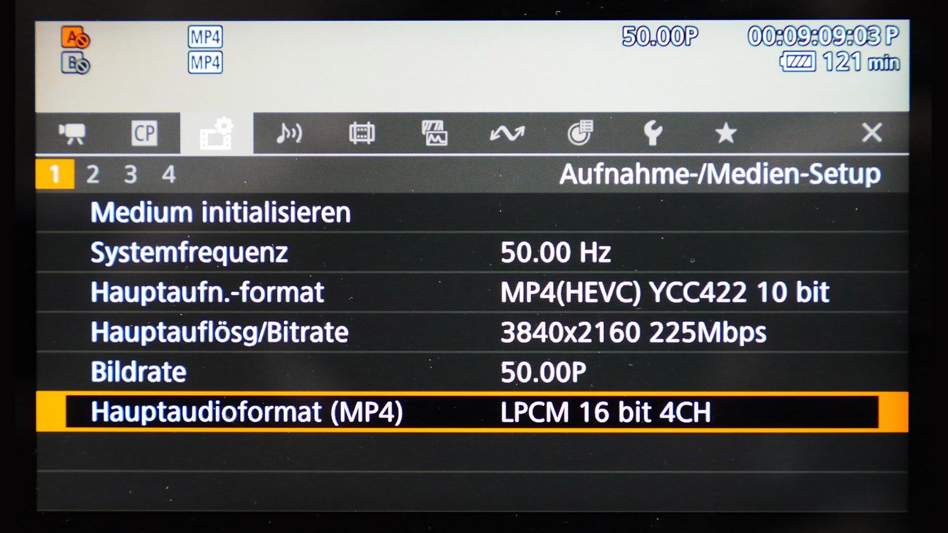 Je nach gewähltem „Hauptaufnahmeformat” zeigt das „Aufnahme-/Medien-Setup”- Menü an, ob das 4-Spur- Recording möglich ist.