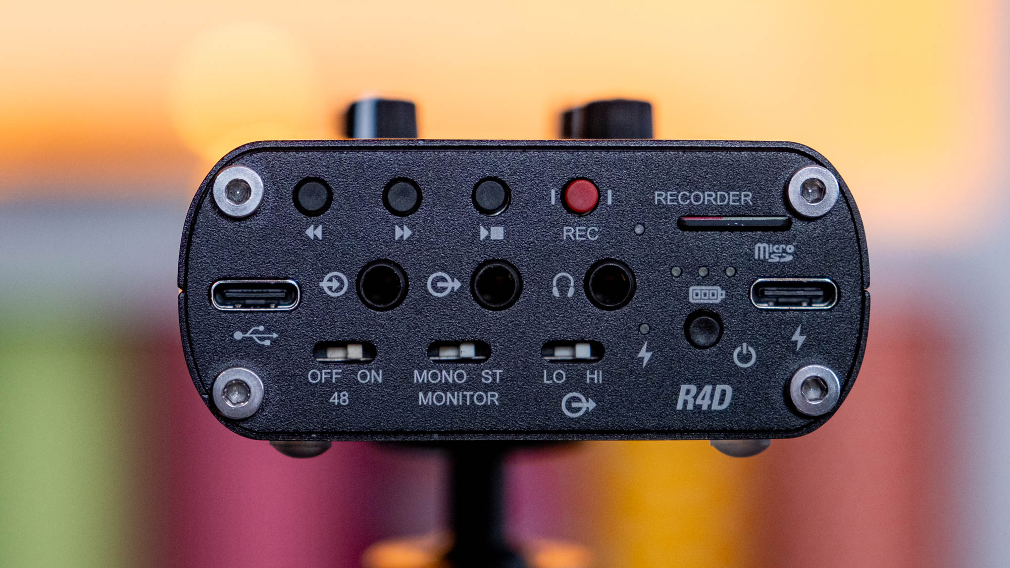 FRONTPANELHinten finden sich zwei XLR/Klinke-Combobuchsen für die Monokanäle sowie zwei Balanced-Outputs im Miniklinkenformat für die Abhöre, deren Signal nach dem Monitor-Regler ausgegeben wird. Die Vorderseite ist bis auf den letzten Platz gefüllt, hier findet man Aux-Eingang und Kopfhörer-Ausgang, einen pre-Monitor-Ausgang für den Anschluss an eine Digitalkamera sowie zwei USB-C-Ports, links als Schnittstelle zum Computer und rechts als reiner Ladeanschluss für den internen Akku. Darunter kann man, wieder über eingelassene Schalter, die Phantomspeisung aktivieren, den Monitorausgang zwischen Mono und Stereo umschalten und den Pegel des Audioausgangs verstärken. Auch die Recorder-Einheit mit dem Micro-SDXC-Slot befindet sich auf der Vorderseite. Deren vier Tasten für Vor, Zurück, Play/Pause und Record sind mit der Hand mit sauberem Druckpunkt bedienbar, die Record-Taste ist durch ihre rote Farbe sofort erkennbar. Nicht zuletzt findet man auch den Anschalter auf der Vorderseite, drei Status-LEDs zeigen den Ladestand des internen Akkus an. Gummipads auf der Unterseite verhindern ein Wegrutschen im Interface-Betrieb, während ein 3/4 Zoll-Gewinde eine einfache Montage ermöglicht.