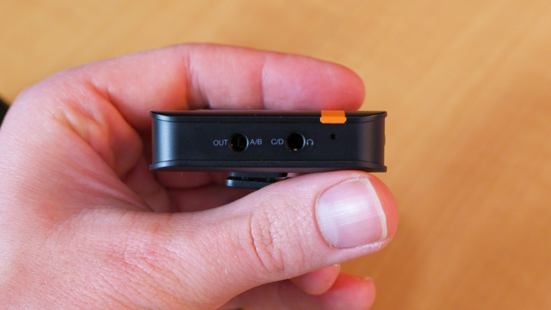 PRAXIS: QUAD-AUFNAHMEComicas Denkweise wird noch deutlicher, wenn man in den Quad-Modus wechselt. Jetzt kommt der zweite Klinkenausgang ins Spiel. Denn während Sender A und B über den Hauptausgang ausgegeben werden, liegen Sender C und D am Kopfhörerausgang an. Das Problem dabei ist, dass kompakte Digitalkameras nur über einen Stereo-Klinkeneingang verfügen und man sich daher für einen Ausgang entscheiden muss. Will man beide Ausgänge gleichzeitig benutzen braucht man einen Vierspur-Audiorecorder wie das Centrance Mixerface R4D mit entsprechenden Adapterkabeln oder aber einen auf die Kamera zugeschnittenen Adapter wie beispielsweise den Tascam CLA-XLR2d, dessen 3,5mm-Klinkeneingang dann in Kombination mit dem Audioeingang der Kamera genutzt wird – vorausgesetzt natürlich, die Kamera selbst beherrscht die 4-Kanal-Aufnahme.