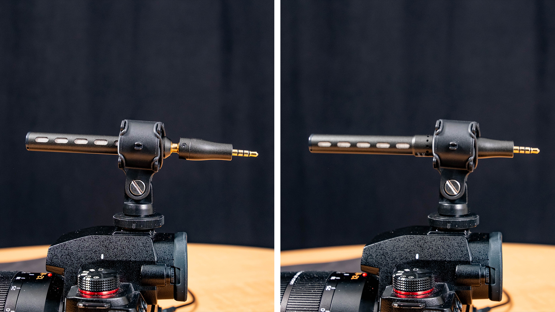 Nur wenn das Drehgelenk inmitten der Spinne sitzt (rechts), sitzt das Mikrofon fest genug in der Halterung. In anderen Positionen (links) ist es zu locker und hat zu viel Spiel, da die Gummis nicht stramm genug sind.